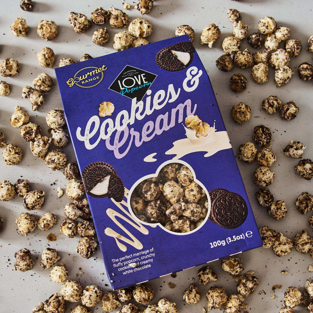 Ingredients: White Chocolate (Contains: Sugar, Cocoa Butter, Whole Milk Powder, Emulsifier: Soya Lecithin, Natural Vanilla Flavouring) (28%) (Contains: Sugar, Cocoa Butter, Whole Milk Powder, Emulsifier: Soya Lecithin, Natural Vanilla Flavouring), Granulated Sugar, Air Popped Corn (22%), Oreo Style Biscuit Crumbs (Contains: Wheat Flour (Wheat), Sugar, Vegetable Oil (Palm), Fat Reduced Cocoa Powder 4.6%, Wheat Starch, Glucose-Fructose Syrup, Salt, Raising Agents (Potassium Hydrogen Carbonate, Sodium Hydrogen Carbonate, Ammonium Hydrogen Carbonate), Emulsifiers (Soya Lecithin, Sunflower Lecithin), Flavouring (Vanillin)), Glucose Syrup, Golden Syrup, Butter (Contains Milk), Rapeseed Oil, Salt, Bicarbonate of Soda, Emulsifier: Soya Lecithin.