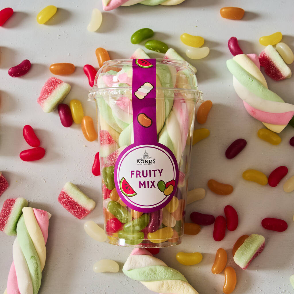 Fruity Mix Sweet Tub Ingredients: Jelly Beans - Sugar, Glucose Syrup, Cornflour, Acid (Citric Acid), Glazing Agent (Carnauba Wax), Colours (Anthocyanins, Lutein, Mixed Carotenes), Flavourings, Sunflower Oil, Stabiliser (Gum Arabic), Plant Concentrates (Safflower, Spirulina). Water melon slices - Glucose Syrup, Sugar, Beef Gelatine, Corn Starch, Humectant (Glycerol), Acids (Citric Acid, Malic Acid), Fruit and Vegetable Concentrates (Safflower, Spirulina, Blackcurrant, Carrot), Gelling Agent (Pectin), Flavourings. Twist Mallows - Glucose- Fructose Syrup, Sugar, Water, Pork Gelatine, Maize Starch, Flavouring, Colour (Curcumin, Carmines, E131).