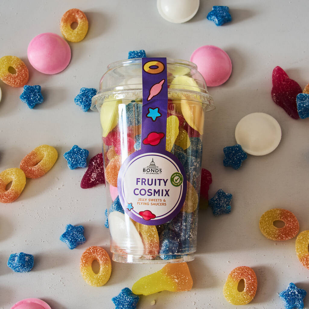 Fruity Cosmix Ingredients: Space Mix - Sugar, Glucose Syrup, Wheat Starch, Water, Modified Maize Starch,Modified Potato Starch, Acids (Lactic Acid, Malic Acid, Citric Acid), Flavourings, Fruit and Vegetable Concentrates (Spirulina, Safflower, Black Carrot, Grape), Colour (Curcumin, Paprika Extract), Vegetable Oil (Coconut), Glazing Agent (Carnauba Wax) Blue Stars - Glucose Syrup, Sugar, Corn Starch, Water, Acids (Malic Acid, Citric Acid), Flavouring, Acidity Regulator (E331), Colour (E133) Peach Rings - Glucose Syrup, Sugar, Corn Starch, Water, Acids (Citric Acid, Malic Acid), Acidity Regulator (Sodium Citrate), Flavouring, Colours (E102, E129) Flying Saucers - Sugar, Maize Starch, Water, Acids (Citric Acid, Tartaric Acid), Dextrose, Acidity (Sodium Citrates, Sodium Carbonates), Colours (Curcumin, Beetroot Red).