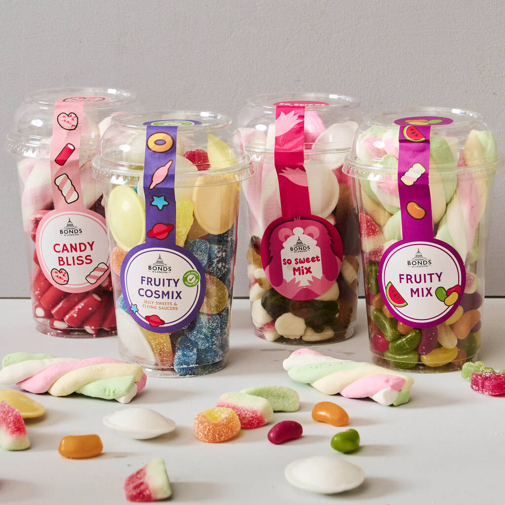 So Sweet Sweet Tub Ingredients: Jelly Mix: Glucose Syrup, Sugar, Juice from Concentrate (Grape, Pear, Pineapple, Peach), Beef Gelatine, Corn Starch, Humectant (Sorbitol), Acid (Citric Acid), Fruit and Vegetable Concentrates (Safflower, Spirulina, Carrot, Apple, Hibiscus, Molasses, Blackcurrant, Lemon), Gelling Agent (Pectin), Flavourings, Vegetable Oils (Coconut, Rapeseed), Glazing Agents (Carnauba Wax, Beeswax), Colours (Curcumin, Paprika Extract). Marshmallows: Glucose-Fructose Syrup, Sugar, Water, Pork Gelatine, Maize Starch, Flavouring, Colours (E100, E162), Spirulina Extract. Flying Saucers: Sugar, Maize Starch, Water, Acids (Citric Acid, Tartaric Acid), Dextrose, Acidity Regulator (Sodium Citrates, Sodium Carbonates), Colours (Curcumin, Beetroot Red).