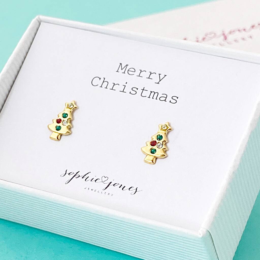 Sterling Silver Gold Plated Christmas Tree Studs With Jewels