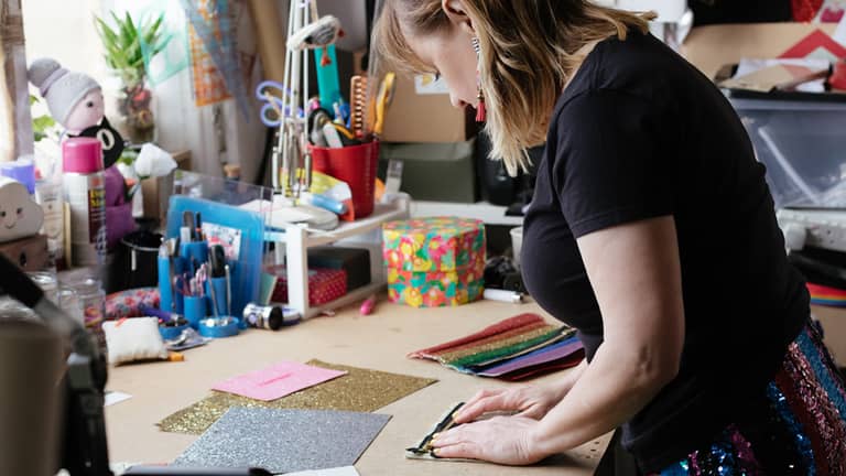 I design and make a range of accessories and apparel including personalised gifts, customised vintage denim jackets and super sparkly capes in my south London studio. I am utterly in love with the making process – the ability to have an idea which I can transform into a product totally inspires me. My raison d’être is to design without rules and make with exceptional attention to detail. This is my ‘why’. It’s what is at the forefront of every new idea and it’s what’s behind every product.