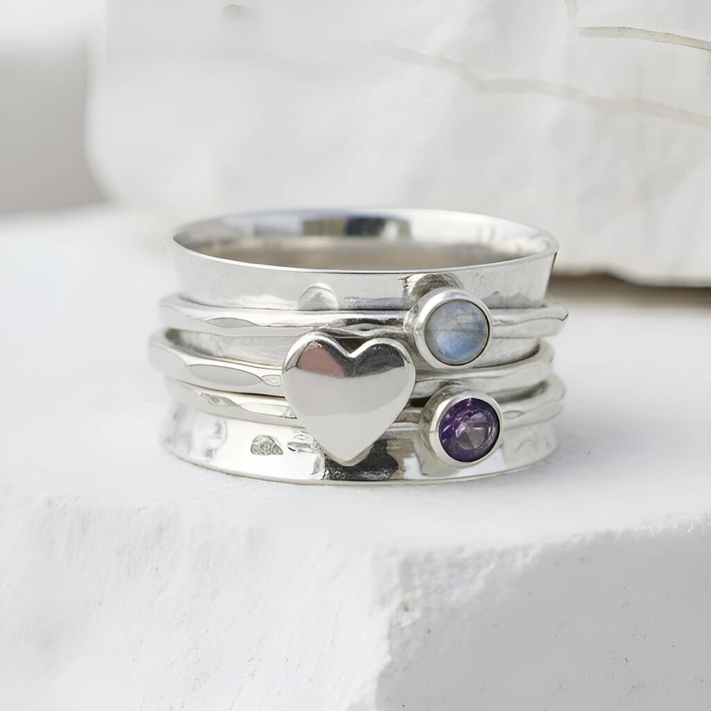 Design: Hammered main band with heart accent; smooth spinning outer bands