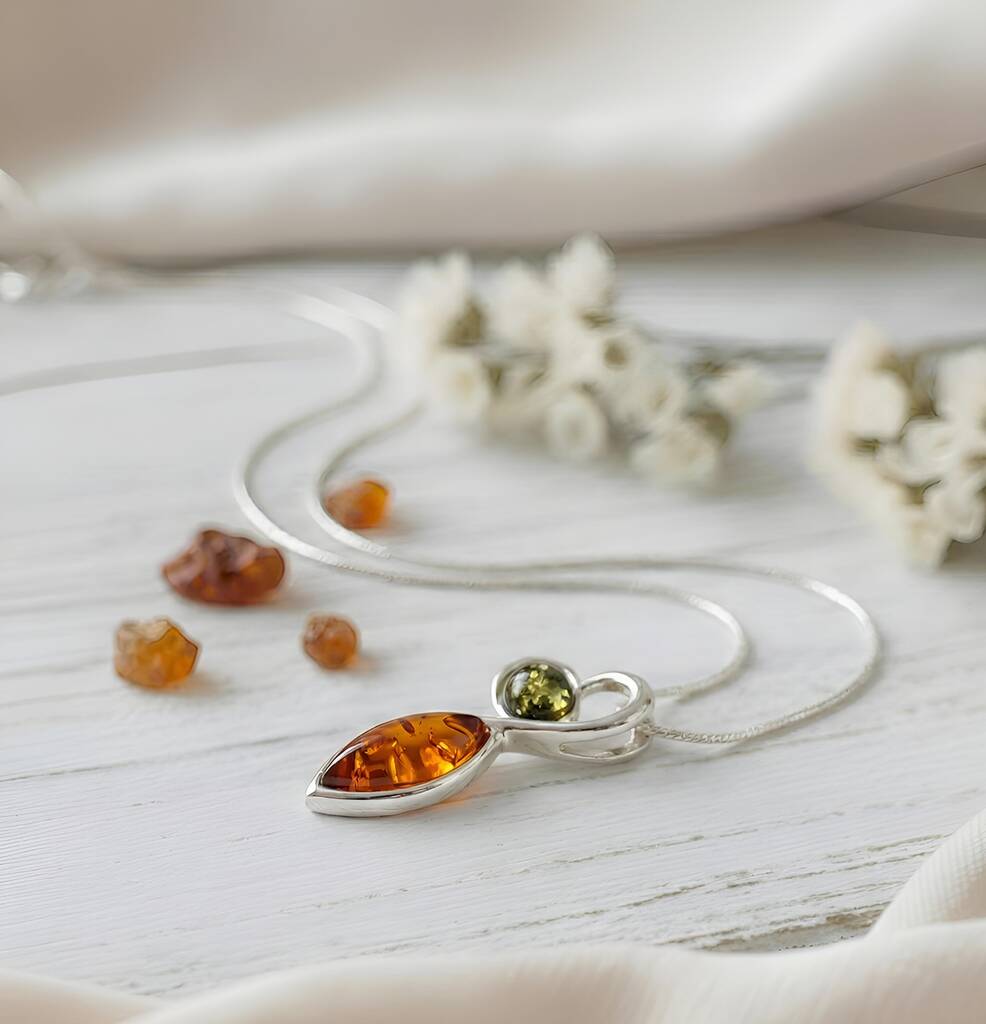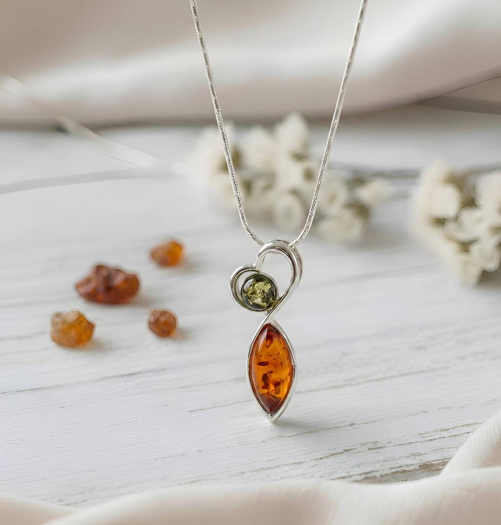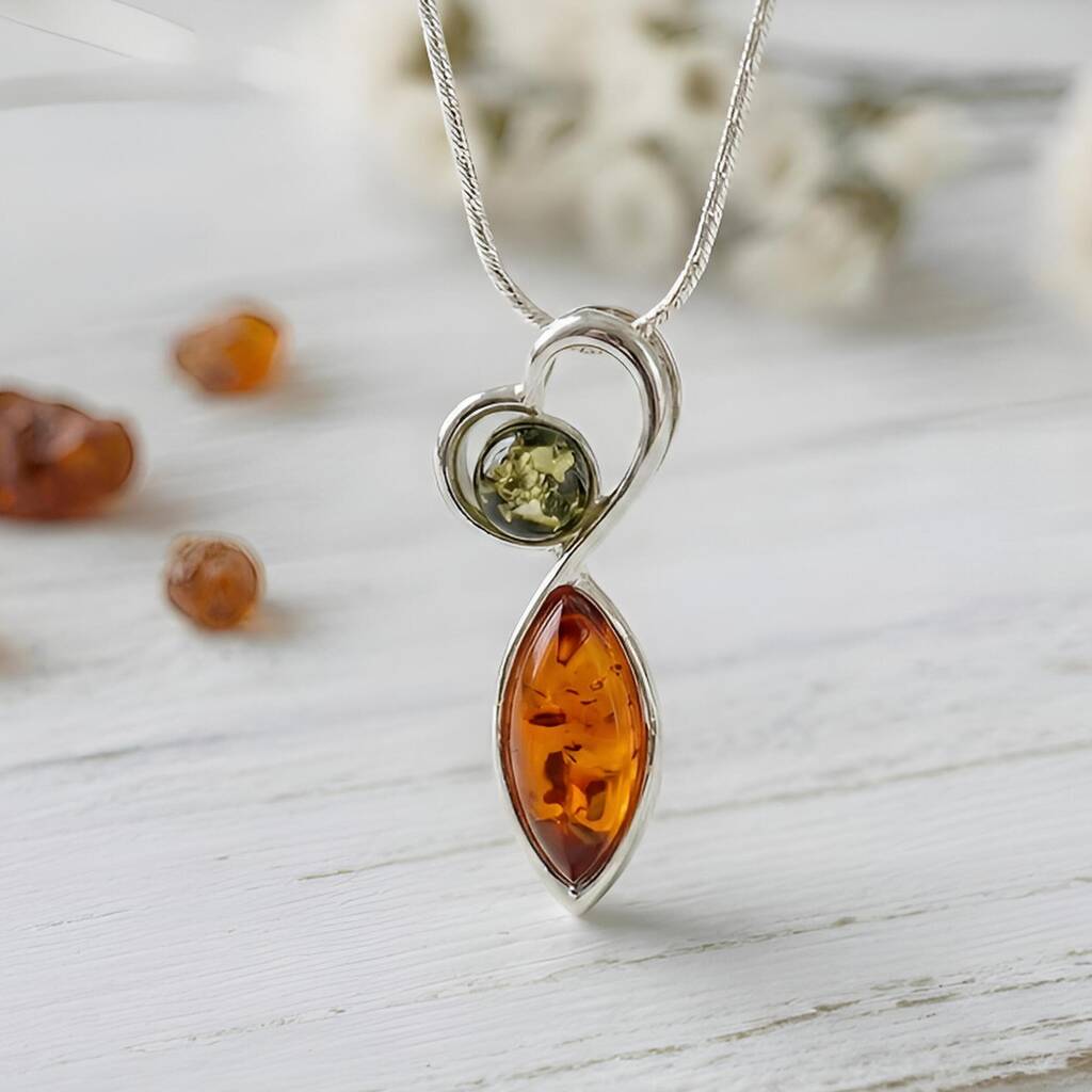 Handmade Baltic amber heart pendant in sterling silver, blending cognac and green stones for a romantic keepsake gift for birthdays, anniversaries or everyday elegance.Lovingly handcrafted from genuine Baltic amber, this elegant pendant pairs a marquise cognac stone with a glowing green cabochon, wrapped in a flowing sterling silver heart. Perfect for women who love meaningful jewellery and warm, natural colour. Ideal as a romantic anniversary, birthday or Mother’s Day gift. Pendant only – chain not included, so you can style it with your favourite necklace. Due to the nature of amber, each piece has unique inclusions and character.