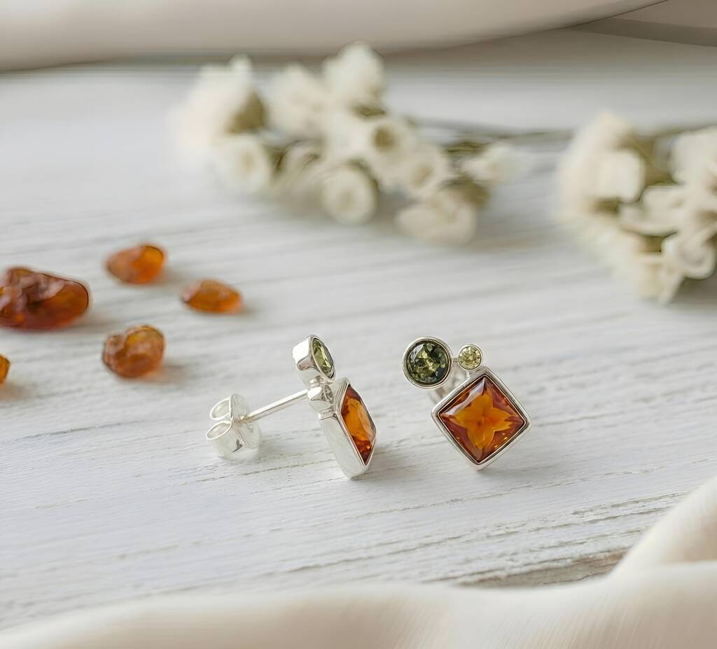 Handmade Cognac And Green Amber Silver Stud Earrings