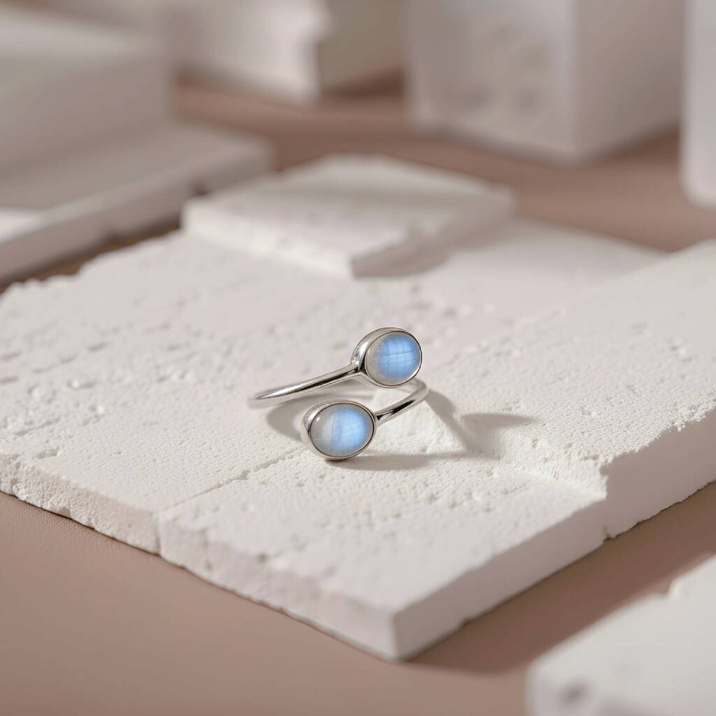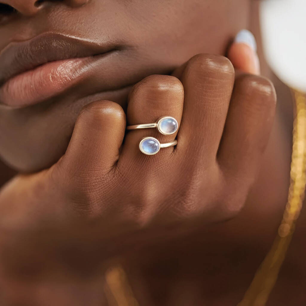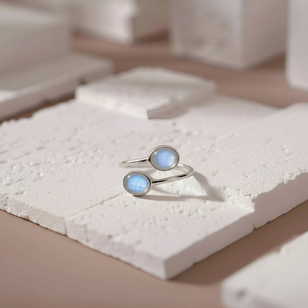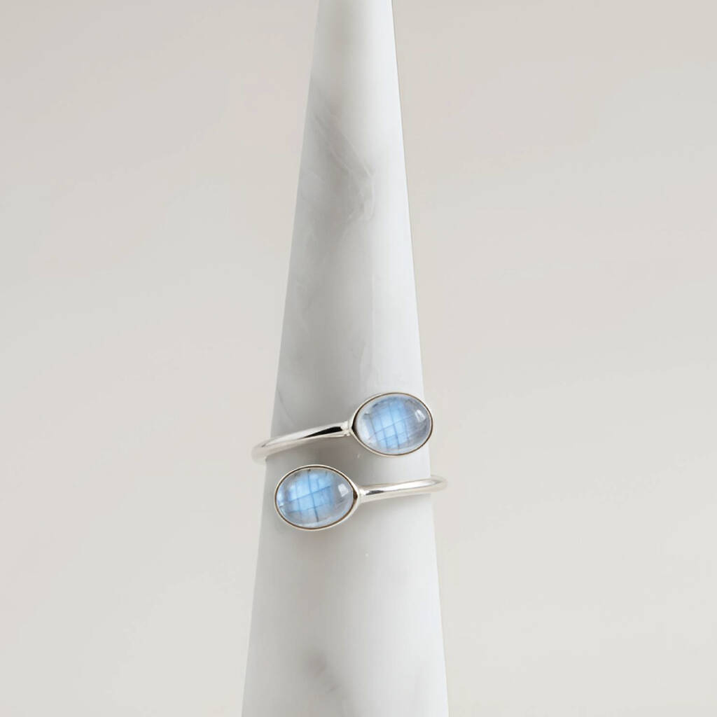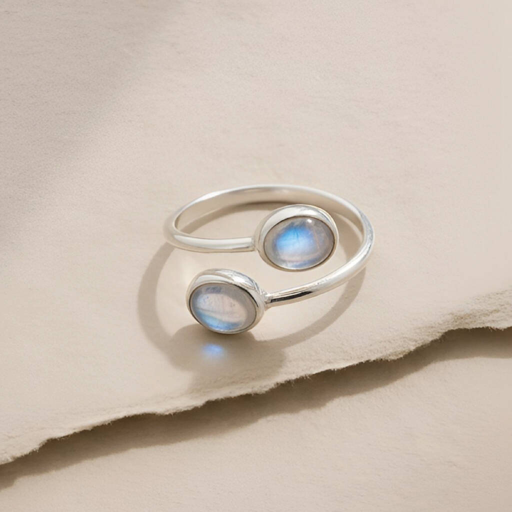 This stunning open ring is adjustable, allowing you to gently flex the sterling silver band to achieve a comfortable and customised fit for different fingers. The dual stones are genuine rainbow moonstones , which naturally exhibit a beautiful adularescence (a blue-to-white sheen), making each stone completely unique.