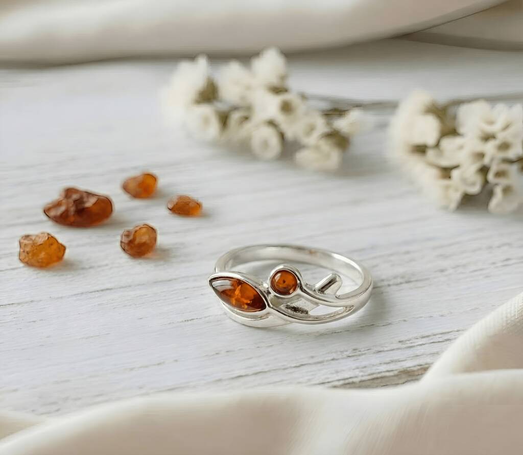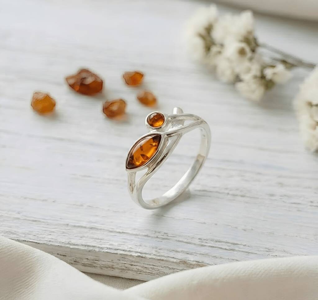 Crafted to capture the essence of the outdoors, this piece combines polished sterling silver with the warmth of genuine Baltic amber. We hand-set a marquise and round stone to create a delicate, botanical silhouette that wraps comfortably around your finger. This silver nature jewellery makes an ideal gift for her, specifically designed for those who cherish artisan craftsmanship over mass-produced accessories. Because natural amber varies slightly in hue, your ring will be a truly one-of-a-kind treasure, perfect for birthdays or marking a special anniversary.