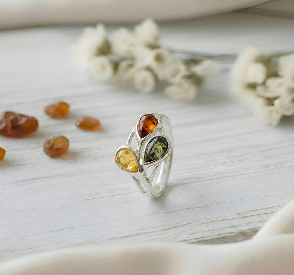Handmade Tricolour Amber And Sterling Silver Teardrop Ring