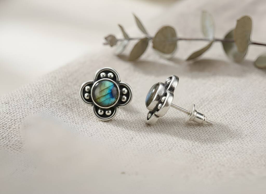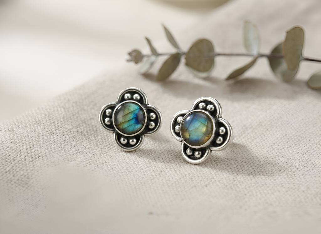 Oxidised Silver Labradorite Clover Stud Earrings
