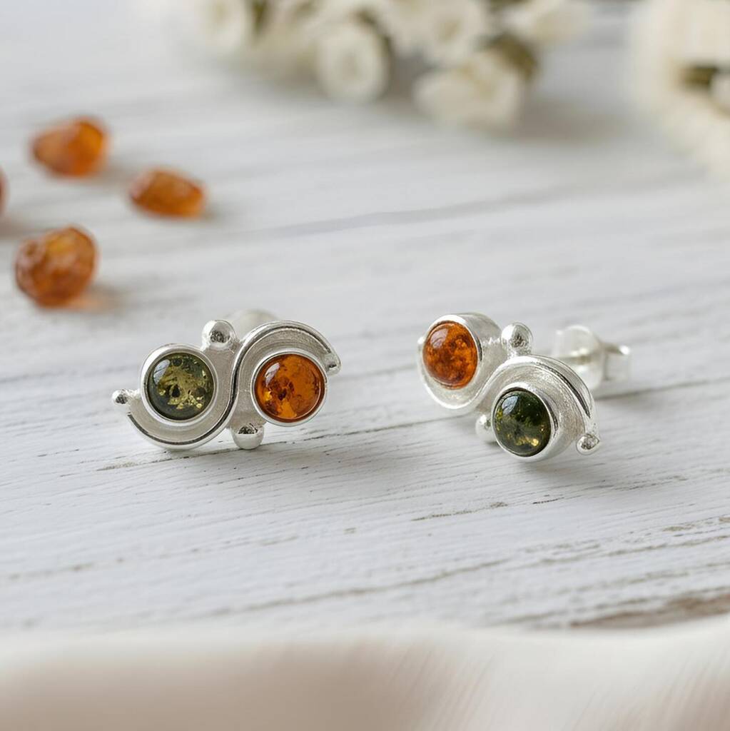 Sterling Silver Green And Gold Amber Swirl Stud Earrings