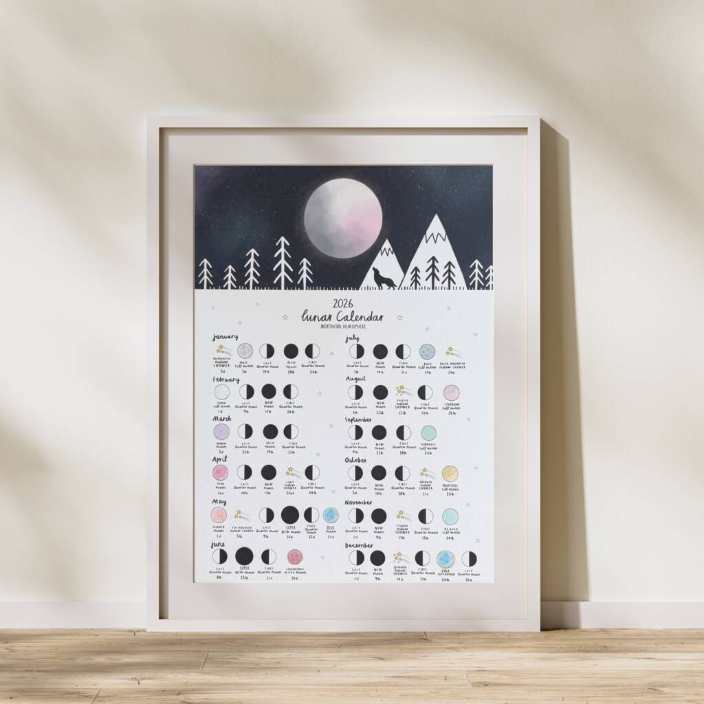 This beautiful calendar print features not only full moon names and moon cycles but also meteor shower dates, making it the perfect companion for stargazers.Meteor Shower Dates: Be ready for awe-inspiring meteor showers, such as the mesmerizing Perseid Meteor Shower.Eco-Friendly PrintingCompostable PackagingIf you're planning a camping trip under the Perseid Meteor Shower, a moonlit stroll under a Strawberry Moon, or simply want to marvel at the beauty of our night sky, this calendar is your gateway to celestial wonders.Beautifully illustrated by Rachel Gale