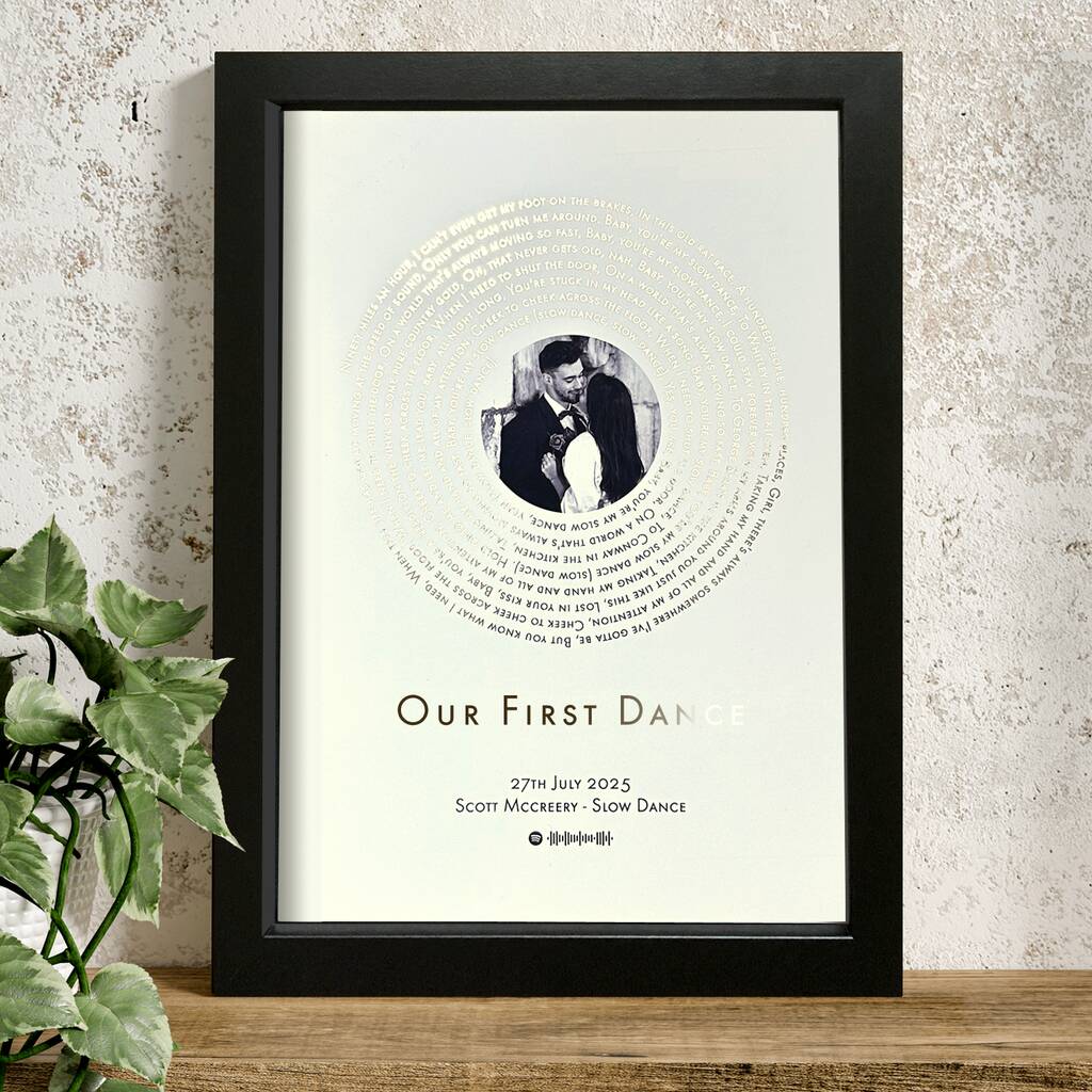A metallic foil record song lyrics photo print which can be fully personalised with your own photo, favourite song lyrics and personal message.
