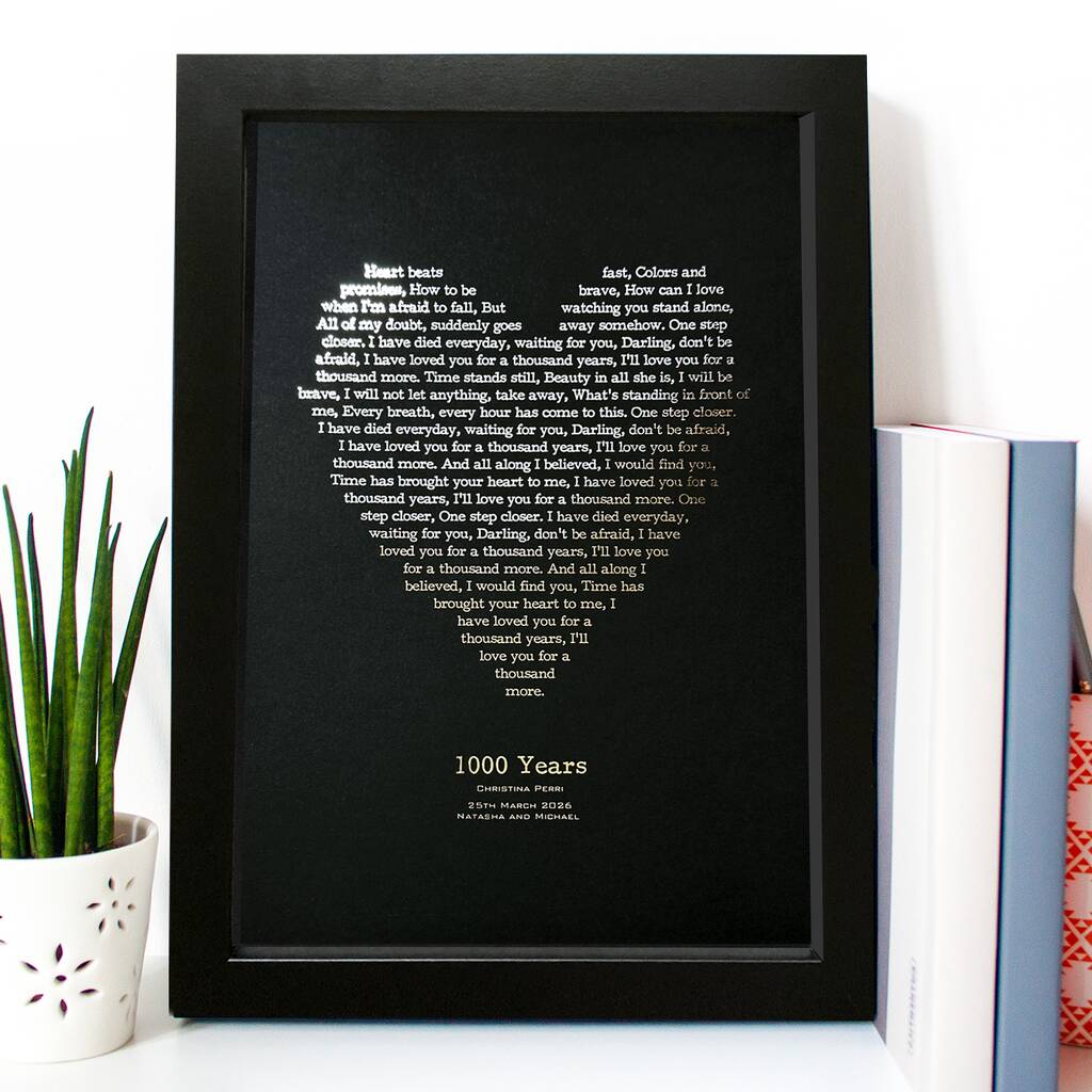 With metallic foil applied to a selection of coloured paper, these lyrics prints make a great gift for any special occasion: Wedding (first dance), Anniversary, Birthday, Engagement, Valentine's Day, Christmas, Father's Day, or Mother's Day.