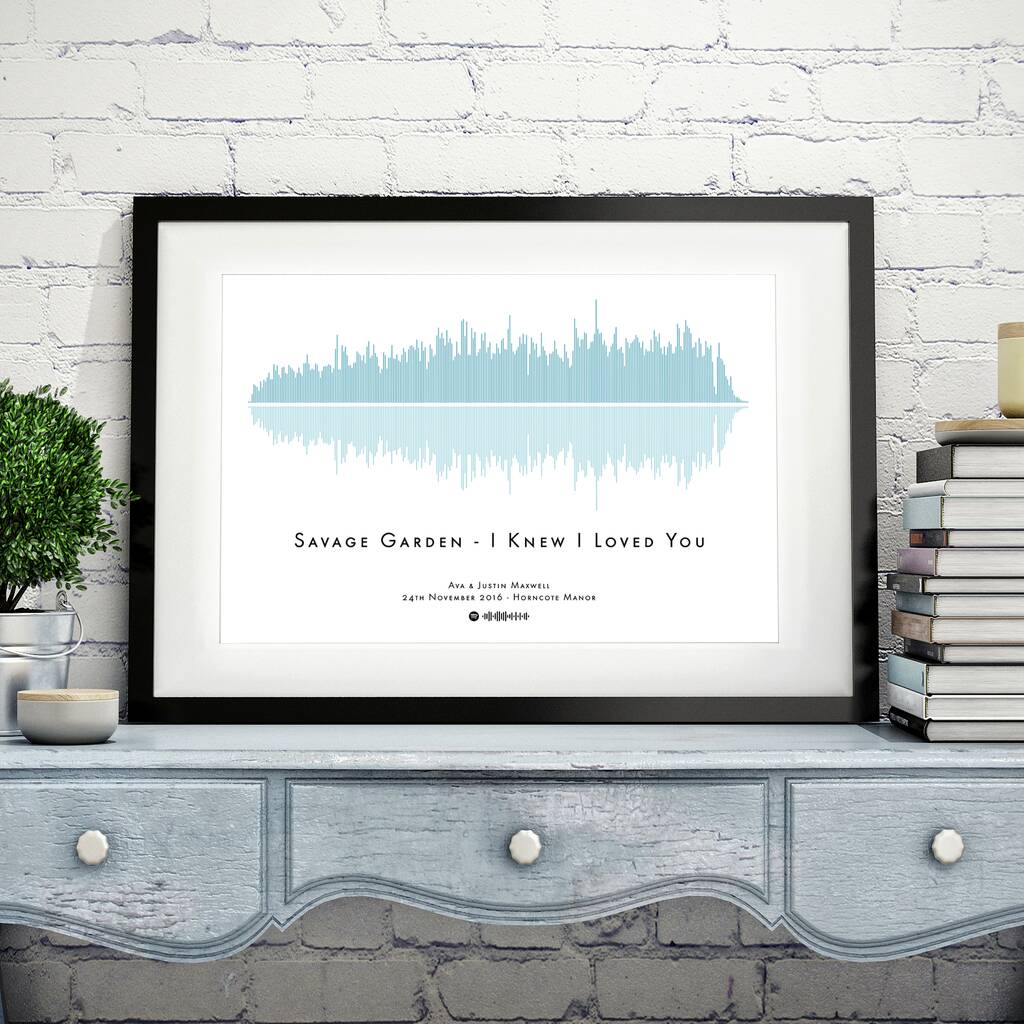 Just provide the song title / artist and we will produce your soundwave (we use the whole song to create your original design). Choose the colour you require (available in 6 different colours - see photo) and an optional message can also be added to the bottom of the print and make it a really personal gift. N.B. We will add the song title and artist automatically but let us know if you don't want them included. Also an optional Spotify code graphic can be added for instant phone scanning to access the song on Spotify.
