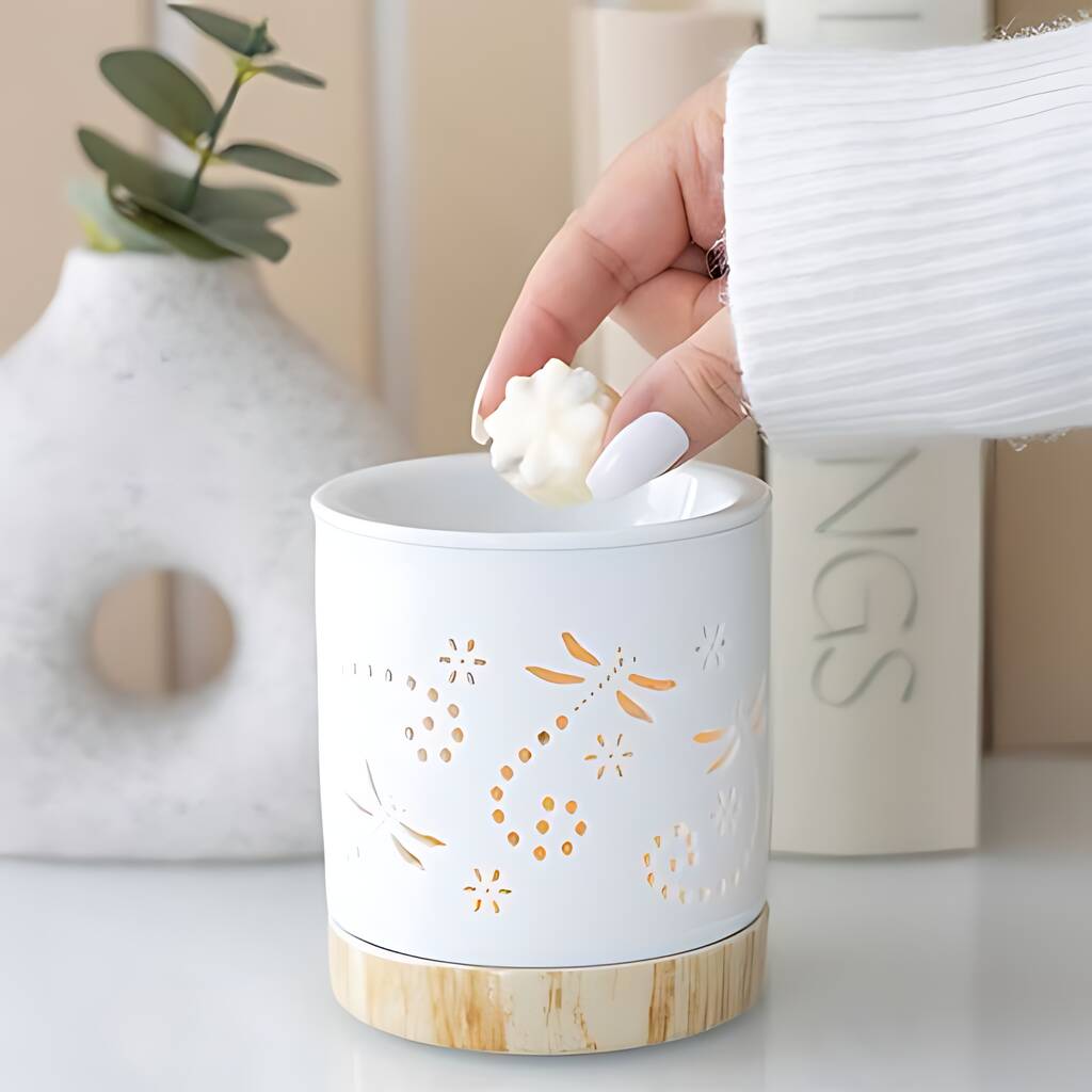 Contemporary matte ceramic oil burner with elegant dragonfly detail and wood-effect base, perfect for essential oils or wax melts, stylish home fragrance gift.This matte ceramic oil burner has a pretty dragonfly detail and a ceramic base with a wood-effect finish giving it a contemporary feel. This item can also be used as a wax melt burner however it is advisable to consider the size and depth of the bowl when adding wax to ensure it will not overrun the edges when melted. Product Dimensions: H11cm x W9.5cm x D9.5cm Packaged Dimensions: H13cm x W11.5cm x D11.5cm