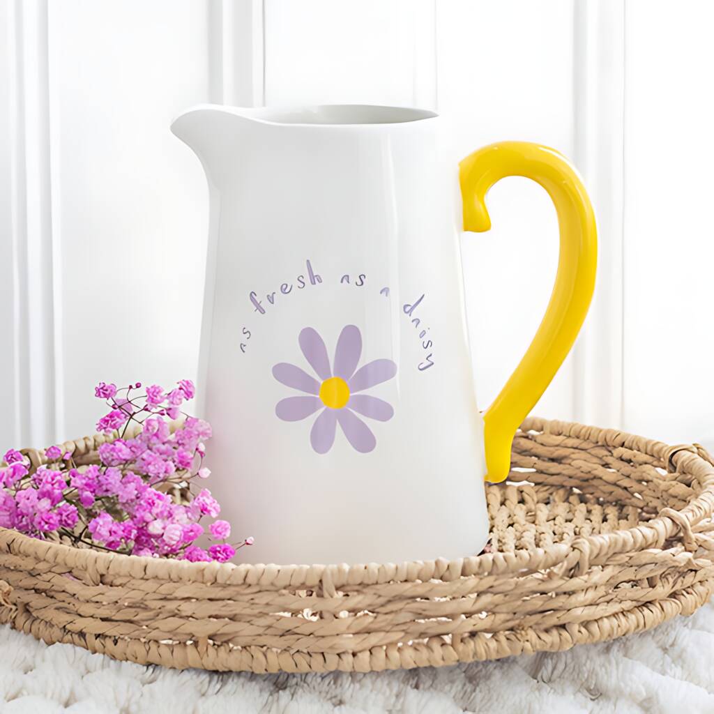 Pretty ceramic flower jug with purple and yellow ‘As Fresh As a Daisy’ design, perfect for spring home decor, displaying blooms on dining tables windowsills.Brighten up the home with this pretty ceramic flower jug featuring a purple and yellow 'As fresh as a daisy' design. Fill with favourite blooms to brighten up the dining table or perch on the windowsill to fill large window spaces and create a welcoming spring display. 1100ml capacity. Do not microwave. Hand wash only. Not suitable for food or drink.