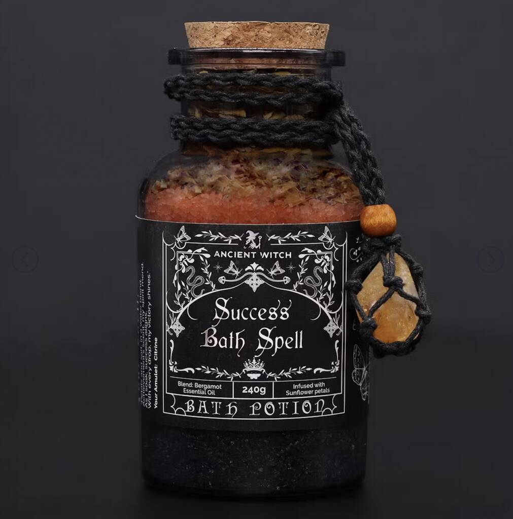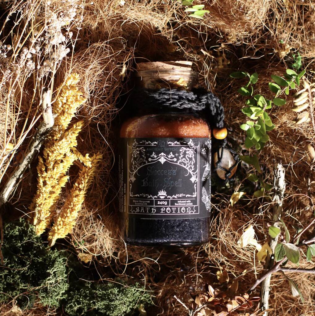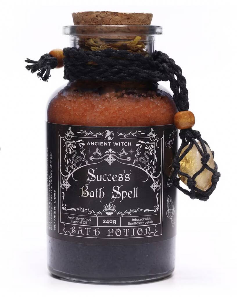 Manifest confidence and attract good fortune with the Ancient Witch Success Bath Spell Potion. This handcrafted 240g bath potion blends Epsom salts, bergamot essential oil, and golden sunflower petals for an uplifting, energising soak that inspires motivation and positive energy.