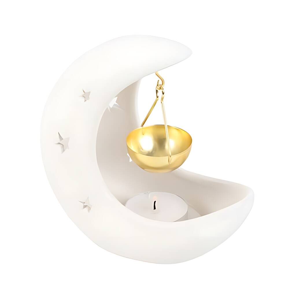 White crescent moon oil burner with star cut-out design and hanging bowl, perfect for fragrance oils, creating a calming celestial ambiance in any modern home.This enchanting white crescent moon oil burner has been designed to enhance the home with a dreamy, magical midnight atmosphere. Fill the hanging bowl with fragrance oil in a mystical scent and watch as the cut out star details cast a celestial glow, adding an ethereal touch to your space. CAUTION: bowl will be hot whilst in use. Recommended for use with fragrance oil diluted with water. Allow to cool completely before handling.