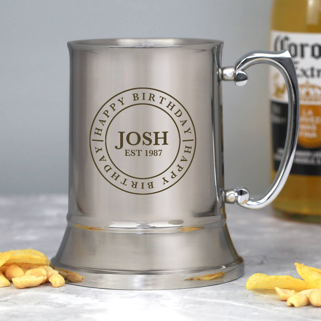 Personalised Silver Stainless Steel Tankard – Happy Birthday Circle Design