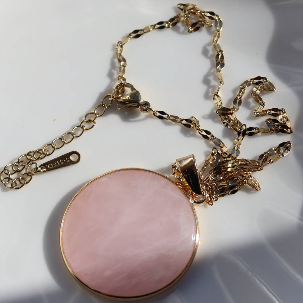 A polished Rose Quartz pendant on a coffee bean chain. Presented in a pink jewellery box with ribbon and a Rose Quartz information card.This elegant necklace features a polished Rose Quartz pendant set in stainless steel with a coffee bean chain. Rose Quartz is often associated with love and harmony, making this a meaningful accessory. Each necklace is beautifully packaged in a pink jewellery box tied with ribbon and comes with a Rose Quartz information card, perfect for gifting or treasuring yourself.