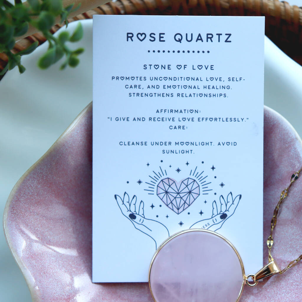 Crafted from natural Rose Quartz stone and 316 stainless steel. Pendant is polished and framed in stainless steel, paired with a coffee bean chain and lobster clasp. Stainless steel provides durability and resistance to tarnishing. Each necklace weighs 11g. Packaged in a pink jewellery box tied with ribbon, complete with a Rose Quartz crystal information card. To care for your necklace, store in a dry place and clean gently with a soft cloth.