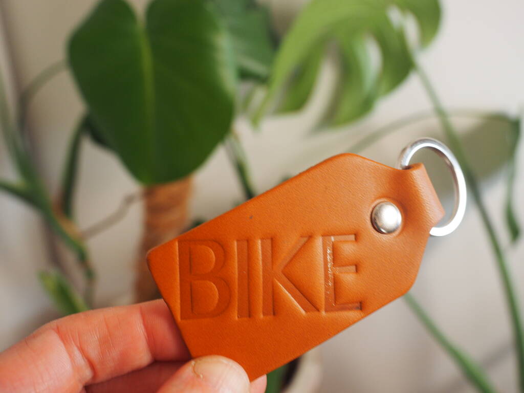 This striking leather key ring comes embossed with the word BIKE in a chunky font on a thick leather fob.