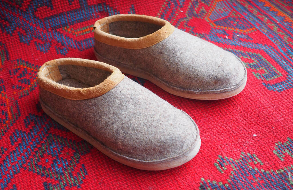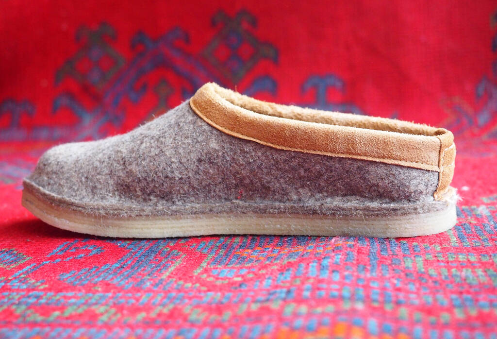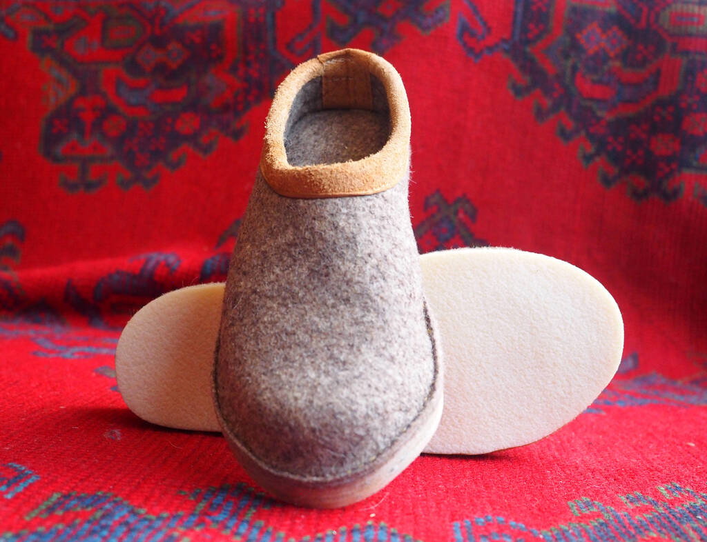These felt clogs are designed and made by us in our Cambridge workshop. They are constructed from British made felt and natural thick rubber soling with a Leather trim. They would make a super Christmas gift and are good for a Mum, Dad, or both.We make the slippers using a wide fitting last allowing toe wriggle and they feel equally comfortable with or without socks. The super thick rubber soles make them suitable to wear outside and the felt allows breathability as well as insulation.
