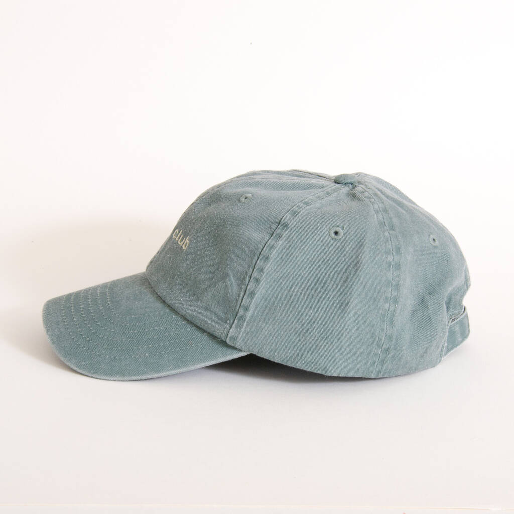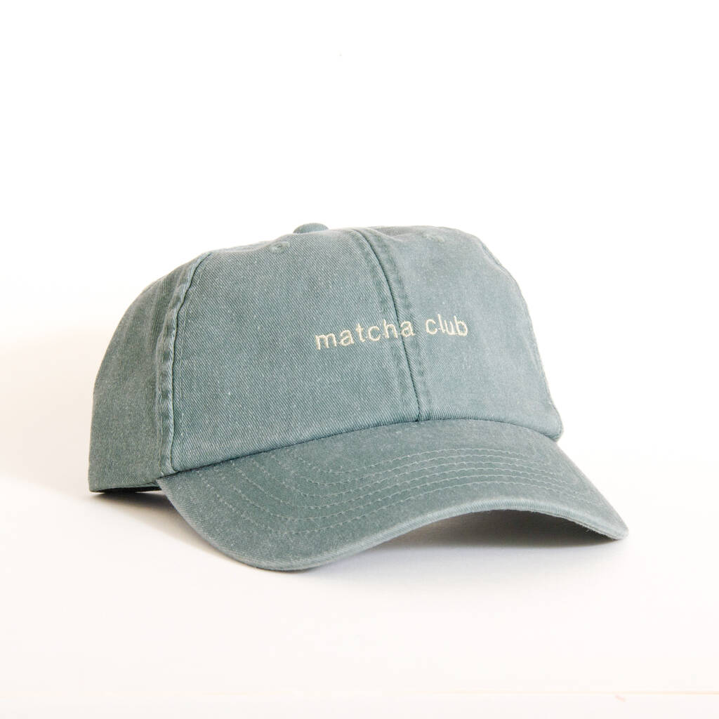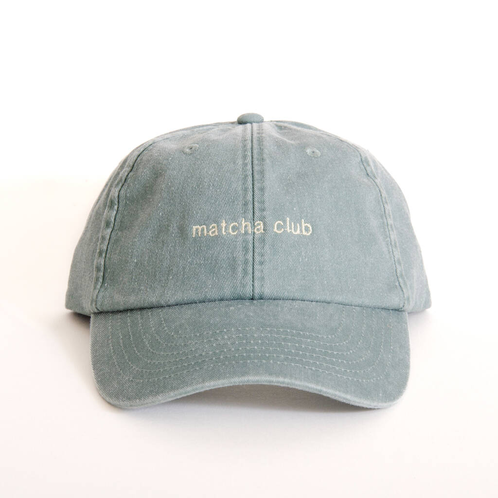 Our embroidered matcha club cap - a washed sage green cotton hat for all the matcha lovers out there.