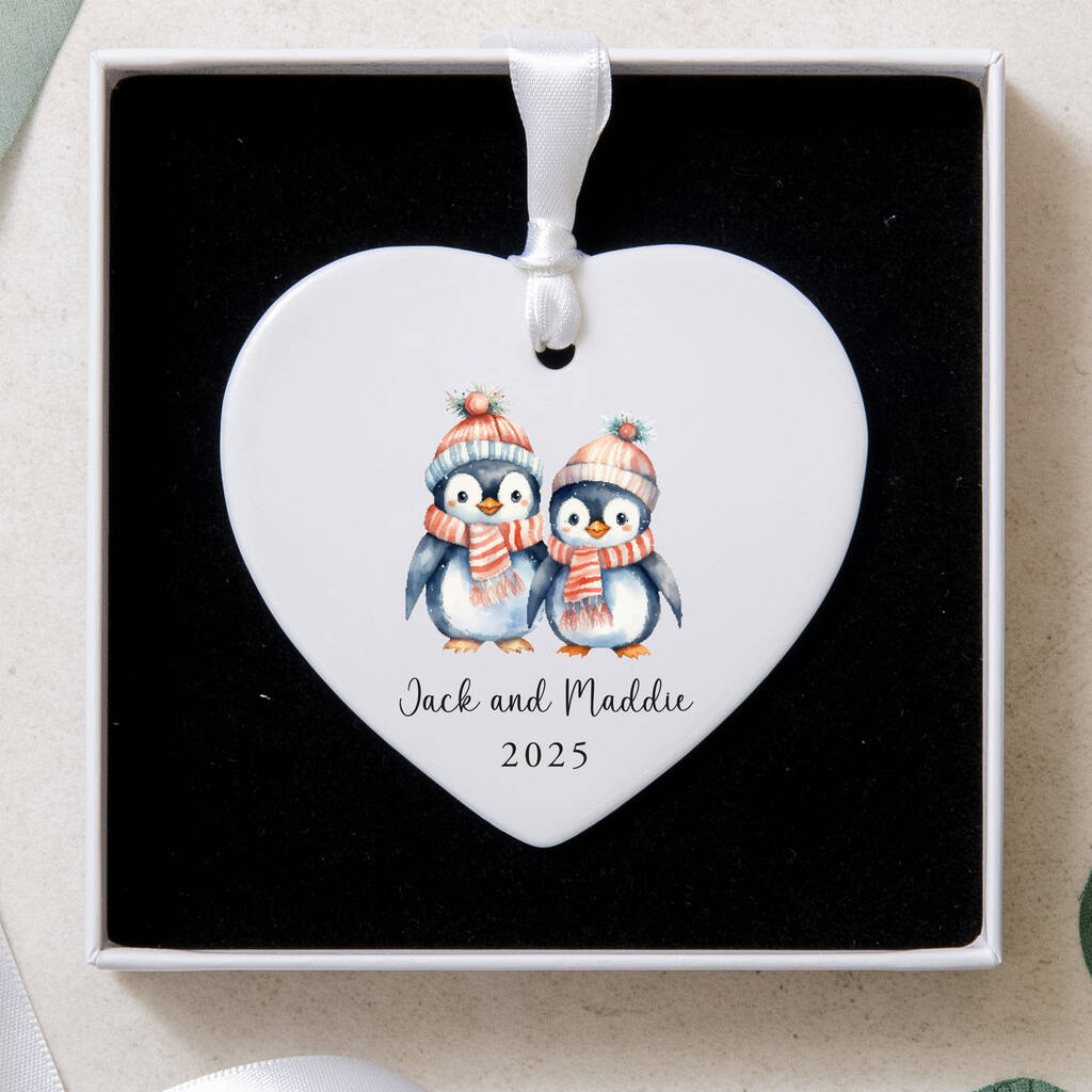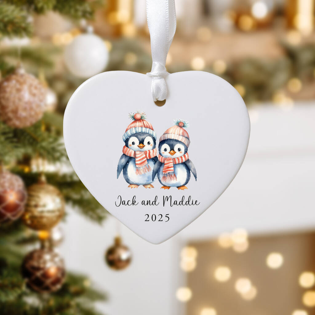 Personalised Penguin Christmas Heart Ceramic Decoration