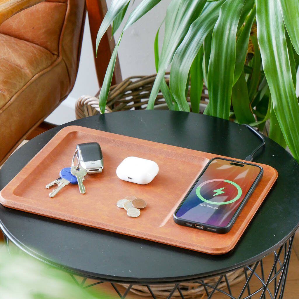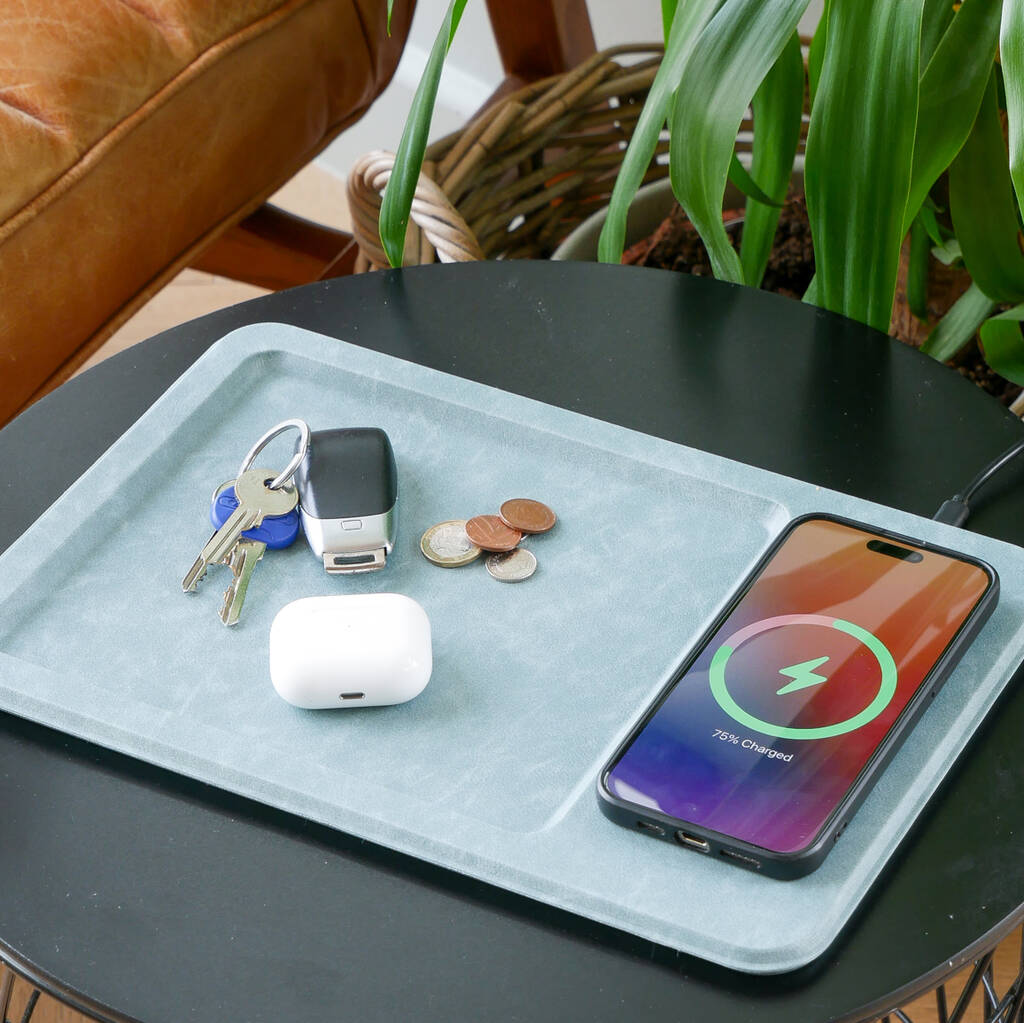 Introducing the PU Leather Tray Wireless Charger – the ultimate fusion of style, functionality, and convenience for your tech-savvy lifestyle. This innovative charger not only powers your Mobile wirelessly - with stylish decktop tray - ideal for one place location for keys, change, wallet - or can be used as a mouse mat too!