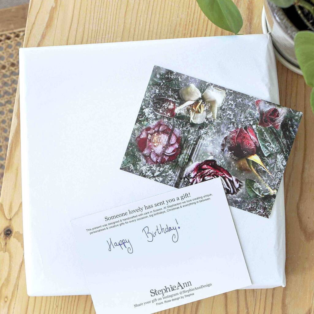 For an extra-special touch, opt for Stephie’s luxury gift wrapping service, featuring kraft paper, satin ribbon, and real pressed flowers from her garden.