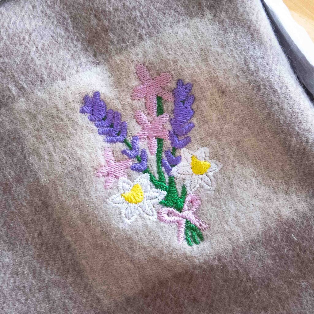 Soft wool scarf personalised with embroidered birthday flowers. Long check design with custom floral embroidery, a perfect gift for her for Christmas and birthdays.