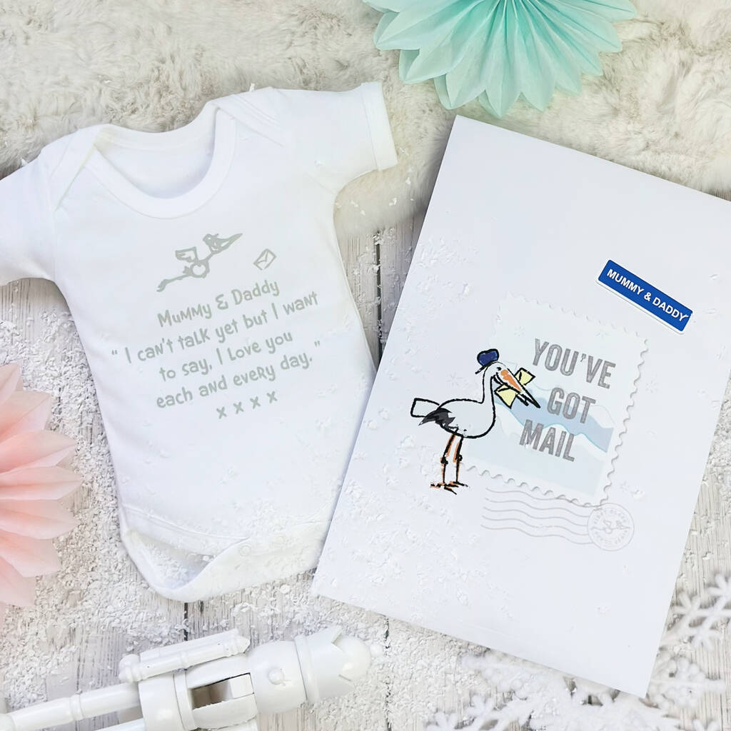 We carefully fold your babygrow and place it into one of our branded cotton bags, this is placed alongside your postcard in a resealable gift envelope.