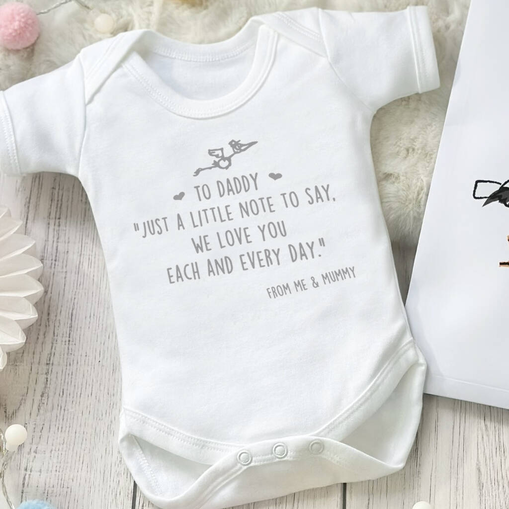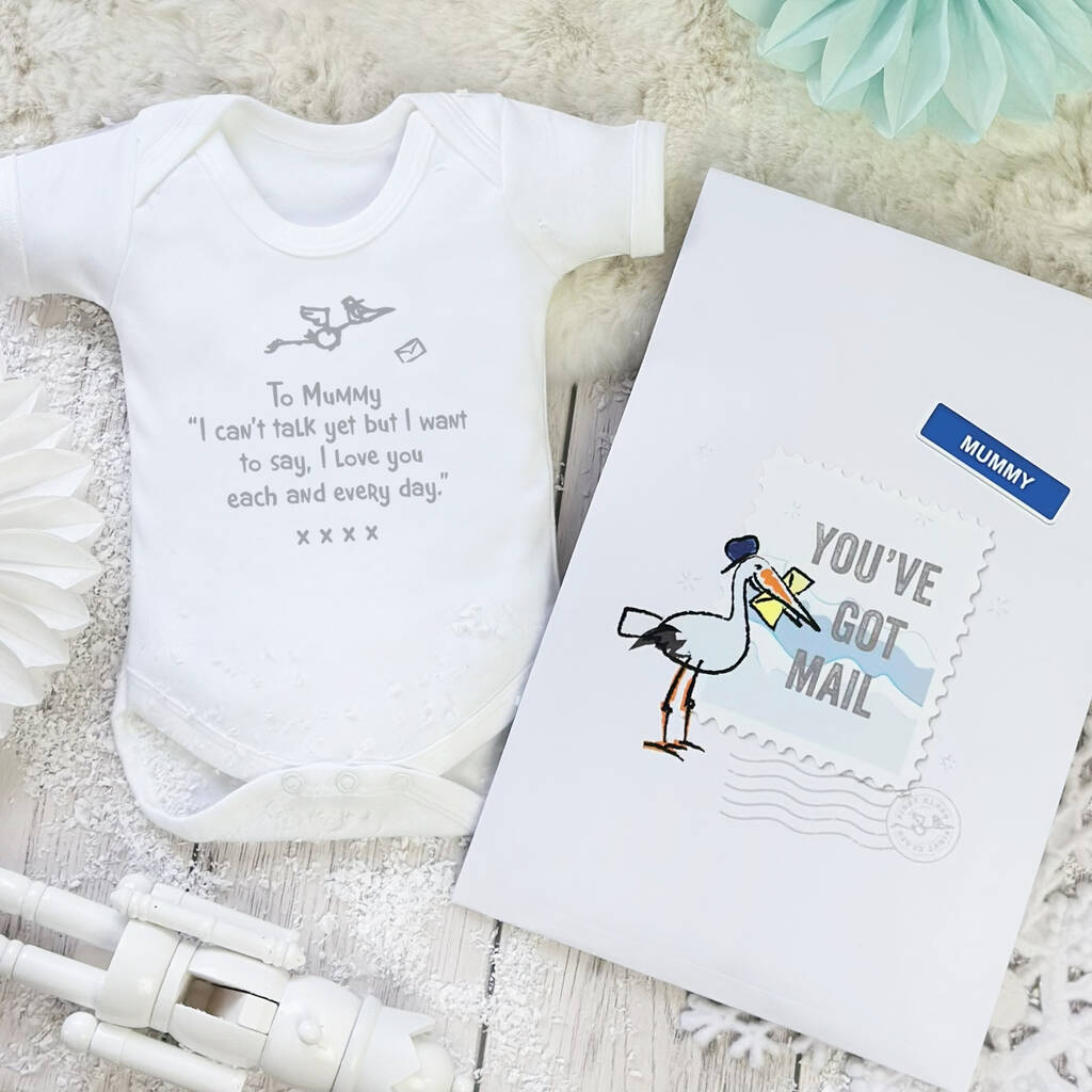 Your gift envelope will contain one white babygrow in a drawstring bag, one individually printed message postcard.