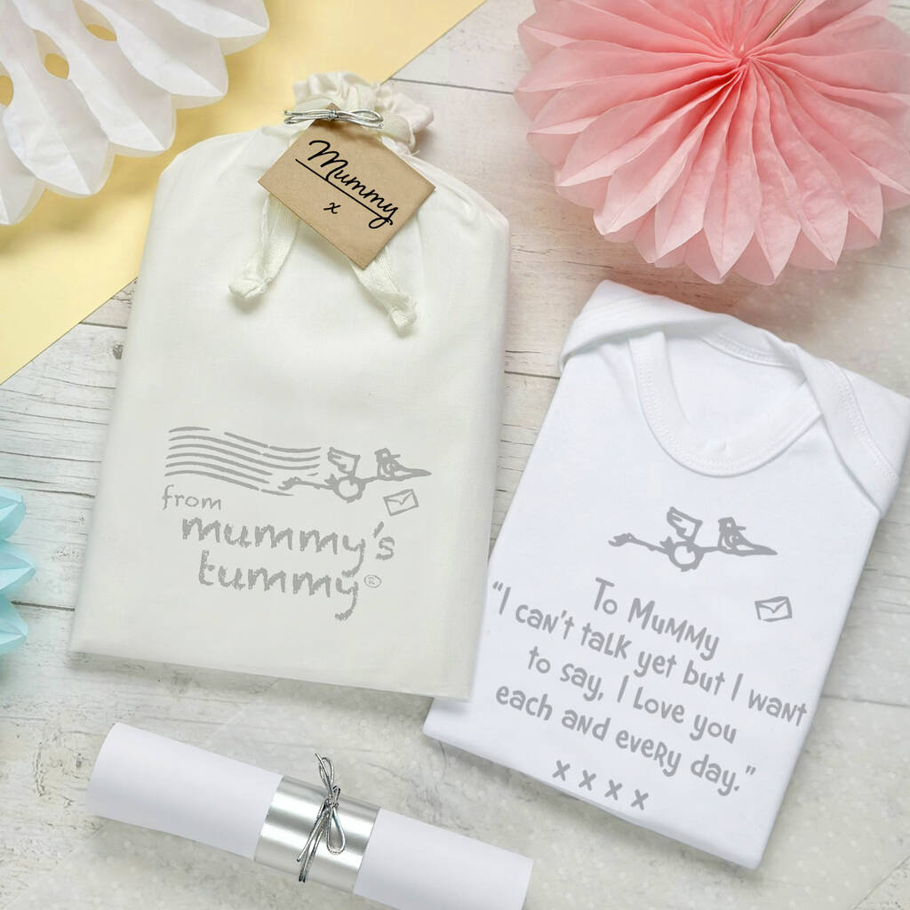 Your box will contain one size 0-3m white sleepsuit, printed in soft neutral grey. And one letter scroll.