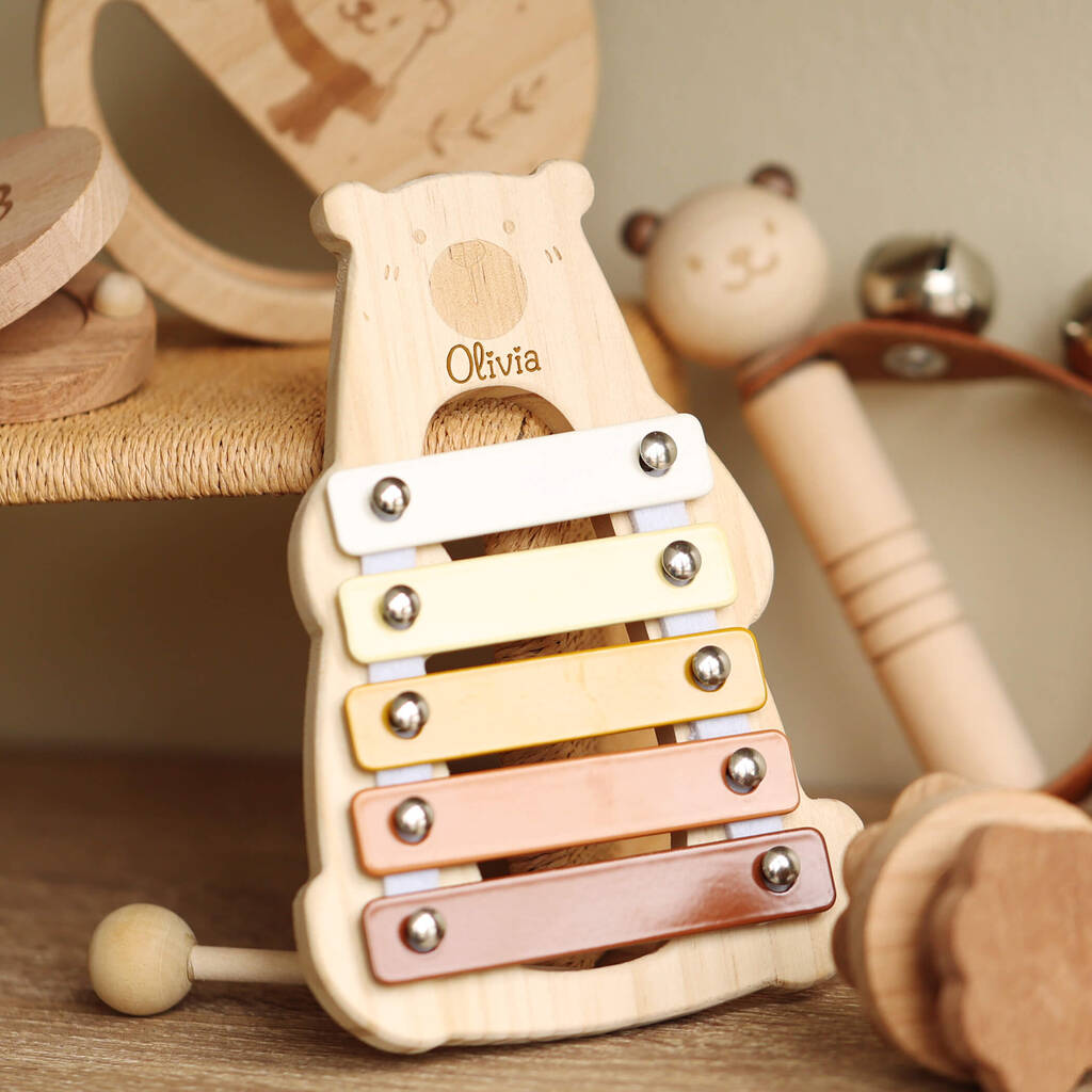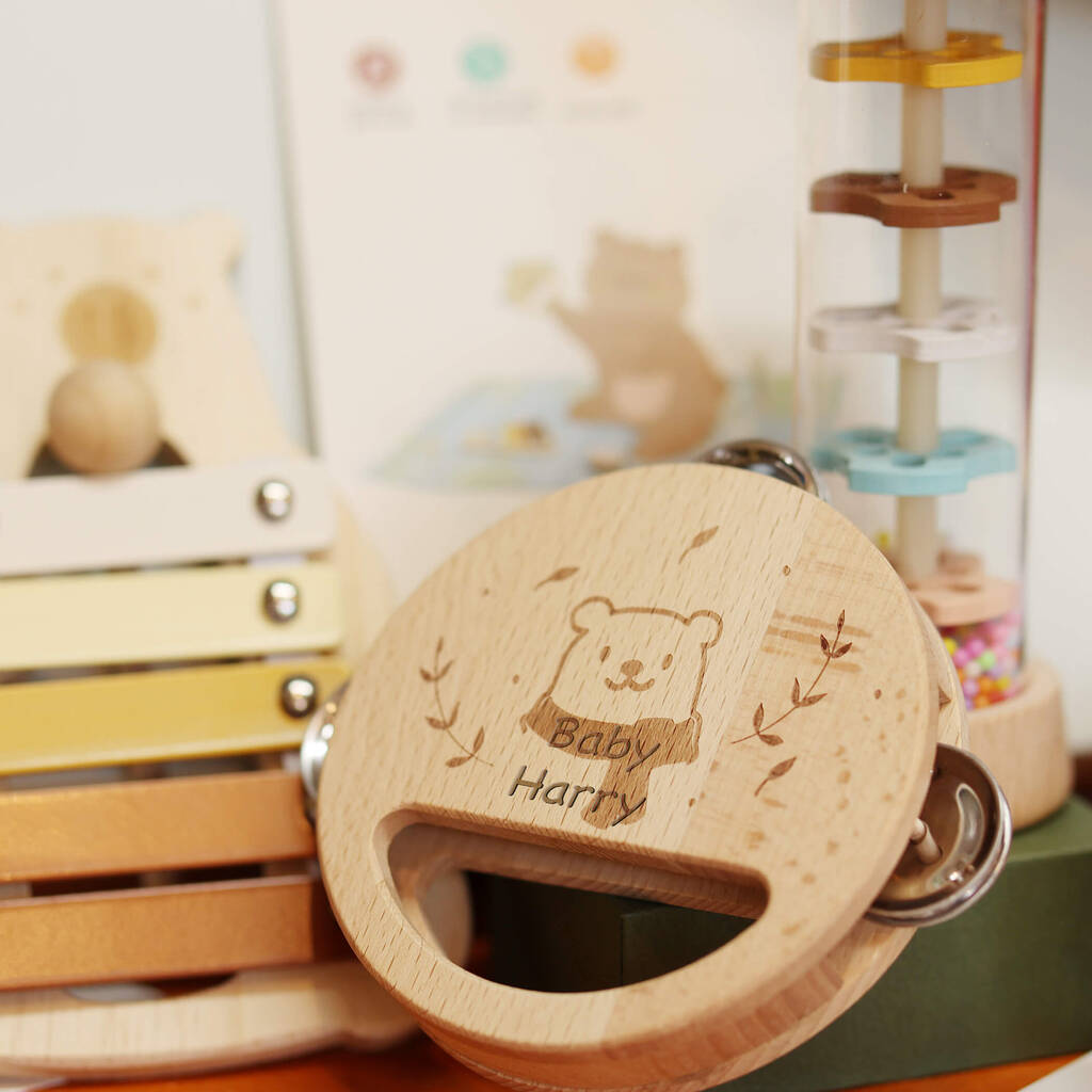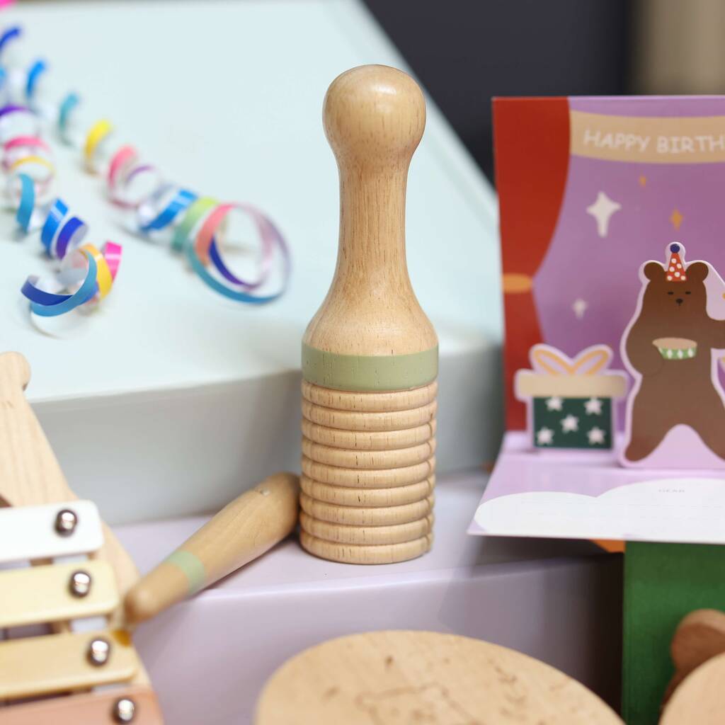 The set includes a charming bear tambourine, bear xylophone, guiro and a bear-shaped rattle—each crafted from sturdy, eco-friendly wood. The tambourine can even be personalised with your child's name, adding that extra special touch! It’s the perfect gift for a toddler who’s just beginning to explore the world of music. The xylophone, with its colourful keys, introduces them to melodies and encourages hand-eye coordination. The delightful wooden guiro lets kids create the enchanting sound of a real frog croaking. Simply glide the stick over the ridged back to produce playful, musical notes. Perfect for young musicians looking to explore the magic of sound in a fun and engaging way, while the rattle provides tactile fun with its smooth, easy-to-grip design.