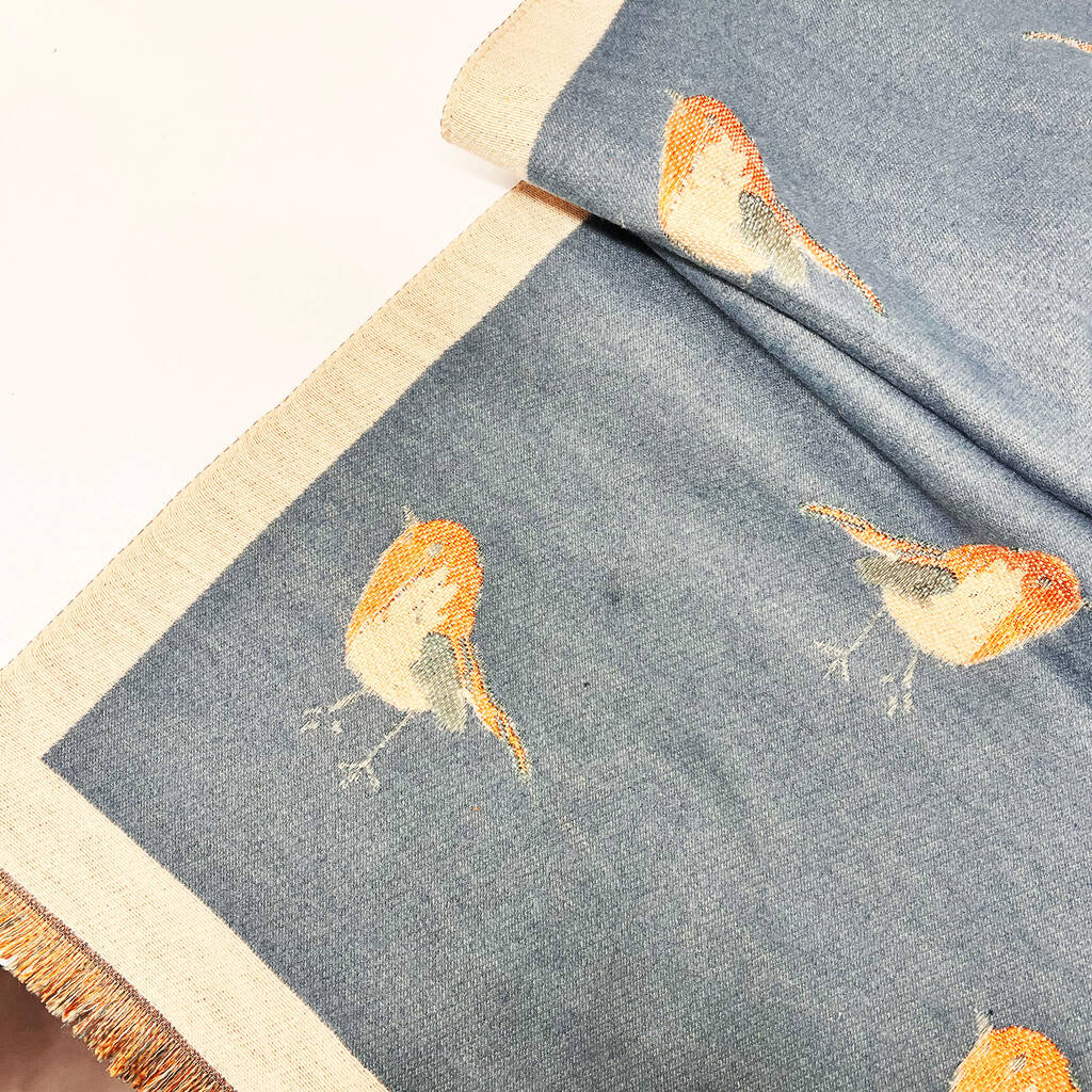 A luxuriously soft cashmere blend scarf that effortlessly jazzes up a plain winter coat, decorated with a cute woven robin.