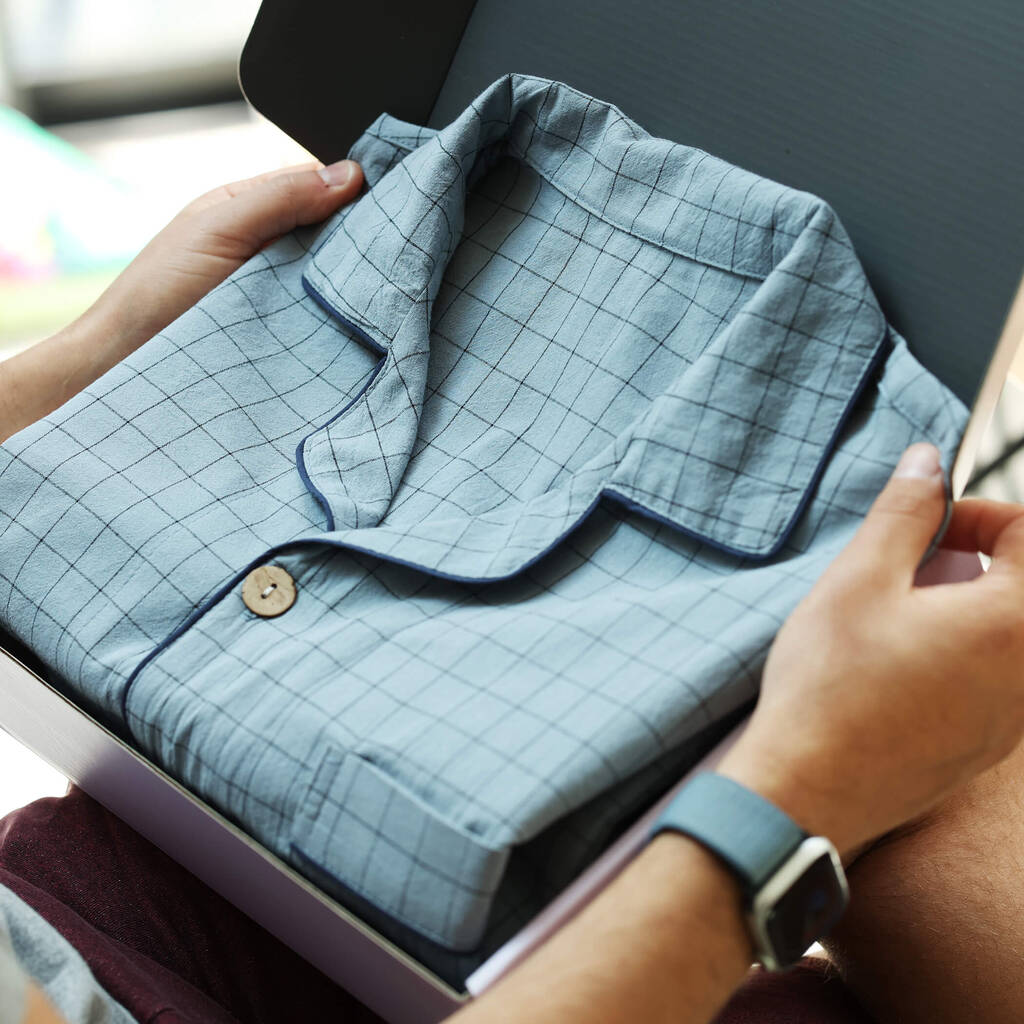 The soft blue check pattern adds a calm, classic vibe, while the breathable, lightweight fabric keeps you cool and comfy whether you’re lounging or sleeping. Cut in a relaxed silhouette with a button-up shirt and elasticated trousers, this set is perfect for slow mornings, cosy evenings, and everything in between. Thoughtfully made from 100% cotton, it’s gentle on skin and built to last wash after wash.