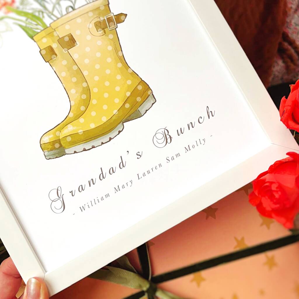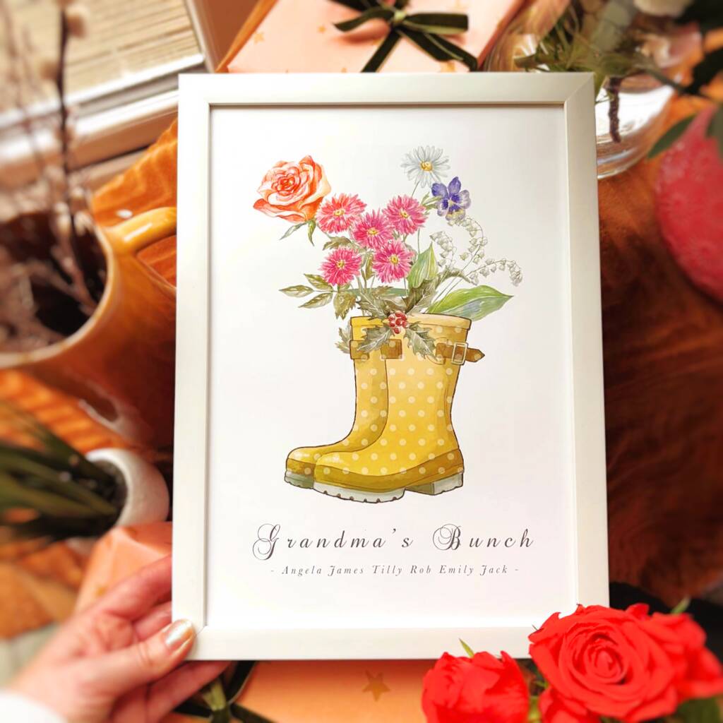 A floral family print featuring each family member's birth flower arranged together inside a pair of welly boots. I make each flower arrangement bespoke for your family.