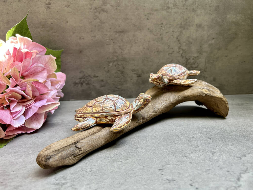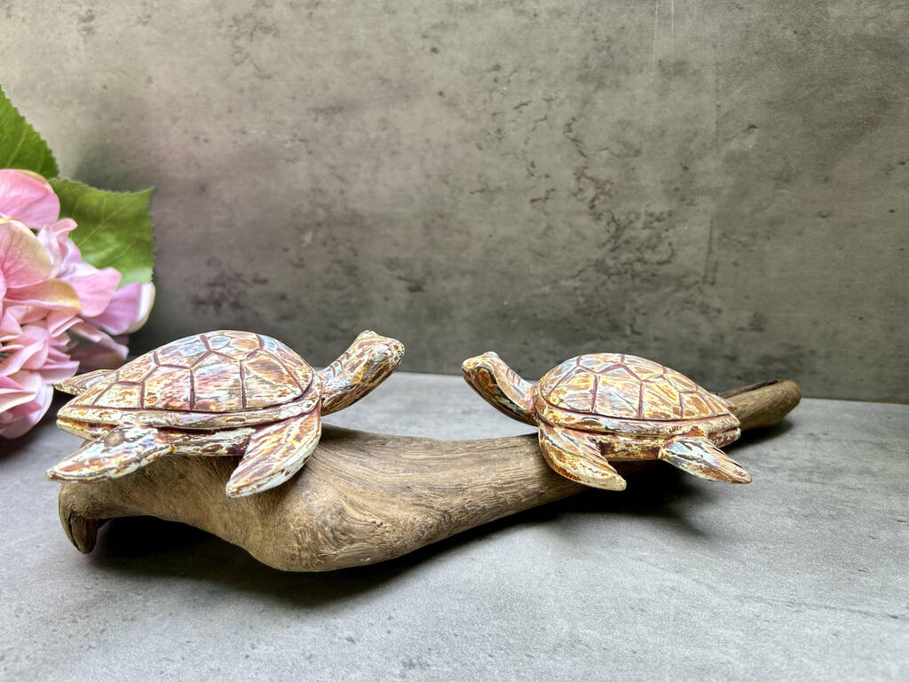 The sculpture features two turtles on a natural driftwood base.