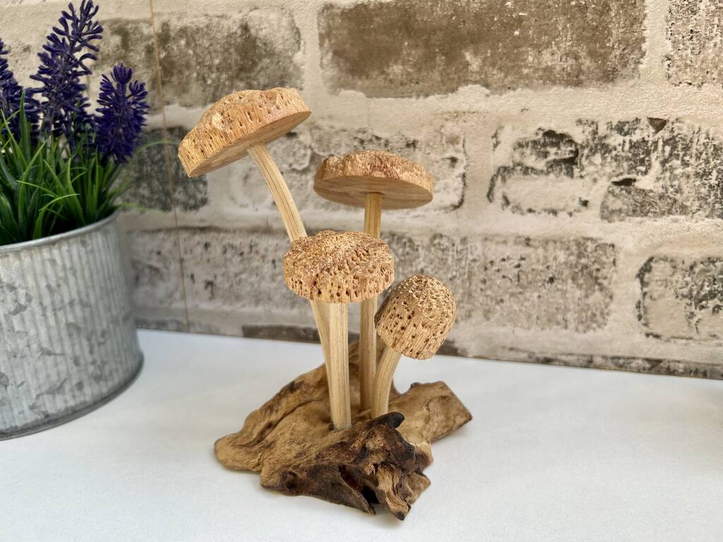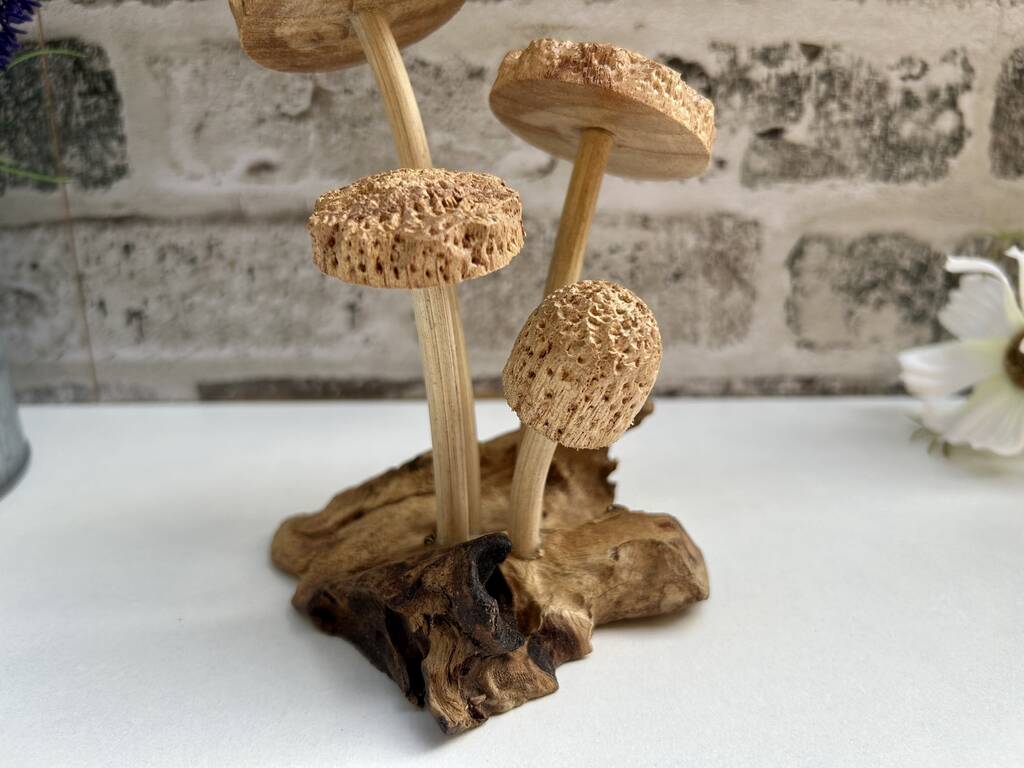 The teak root base features 4 hand-carved mushrooms "growing" from it.