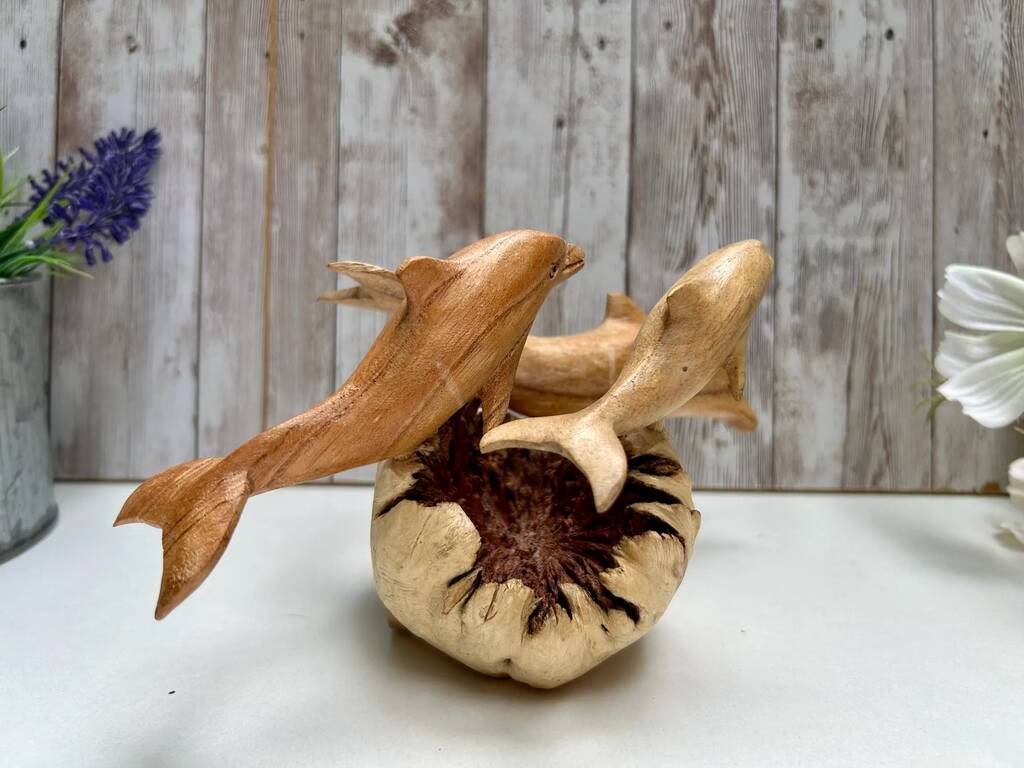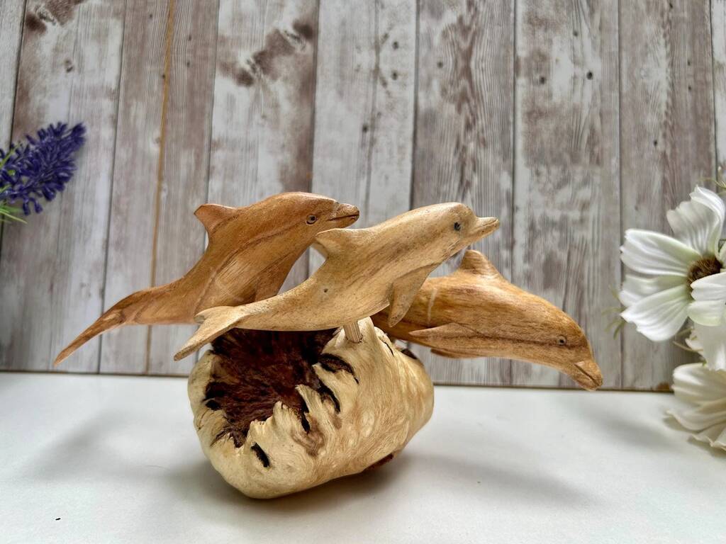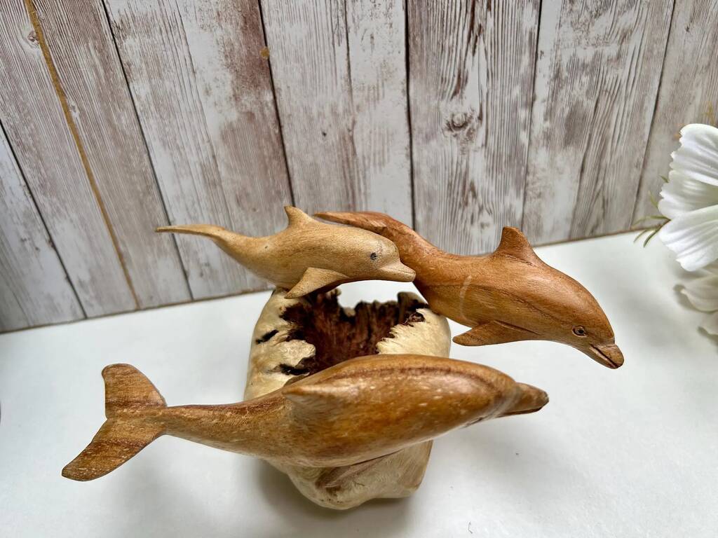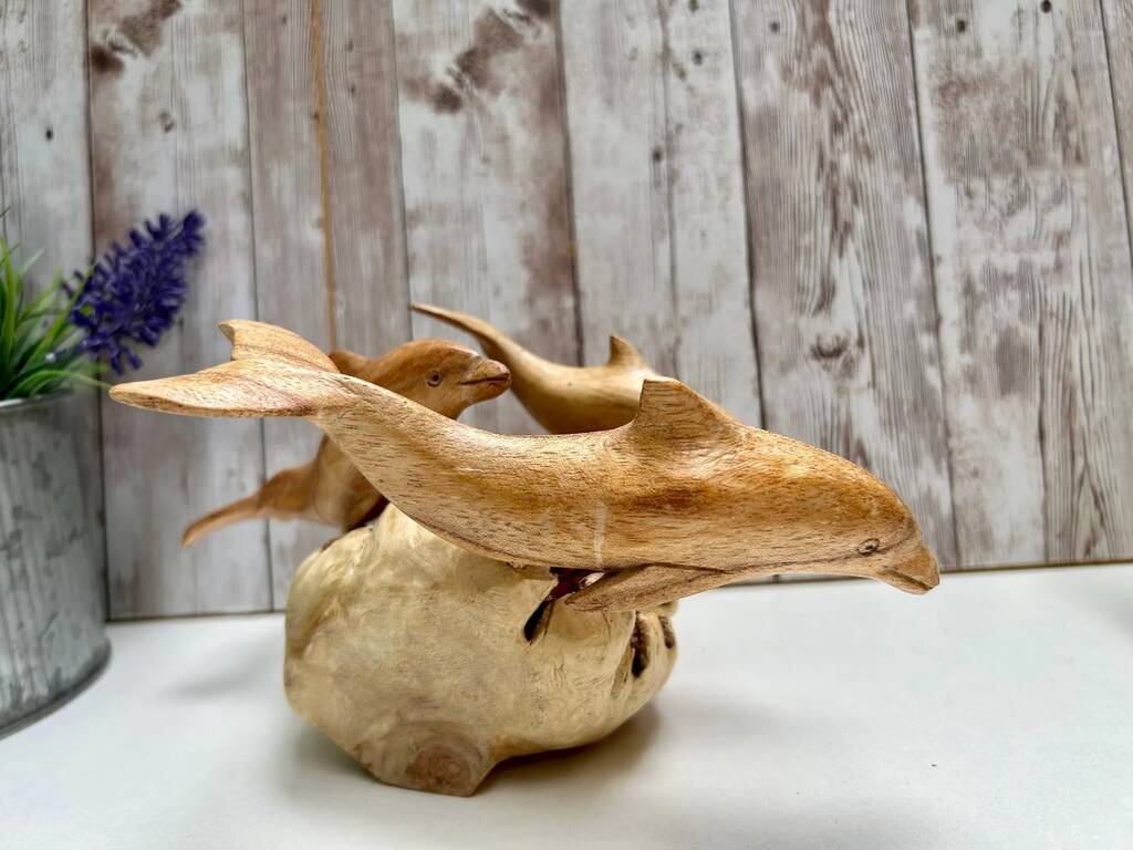 Hand Carved Wooden Dolphin Family Sculpture Ornament
