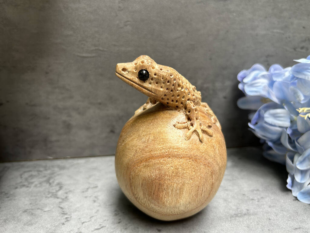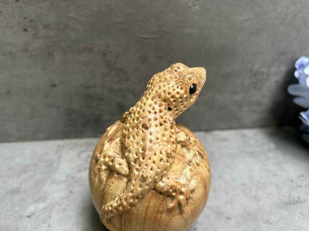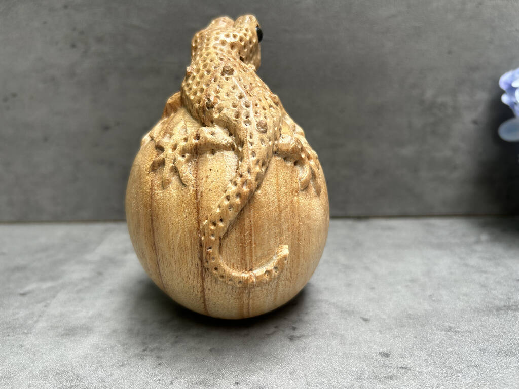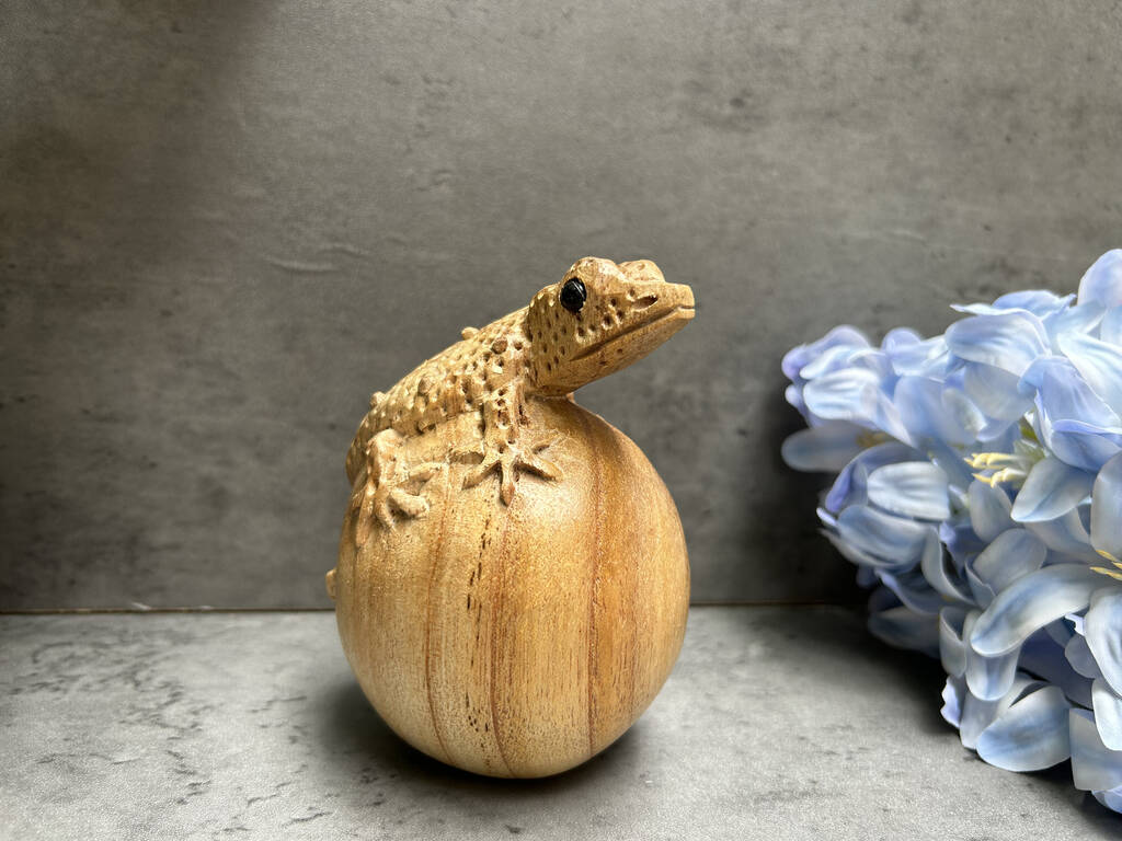 This exquisite handcrafted wooden figurine features a beautifully detailed gecko gracefully perched atop a smooth egg, expertly carved from a single piece of premium wood.The skilled artisan has captured the gecko's distinctive features with remarkable precision, showcasing the natural texture of its skin and the gentle curve of its body as it rests on the egg's surface.