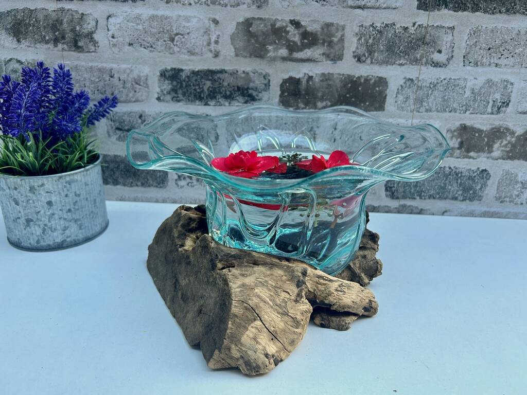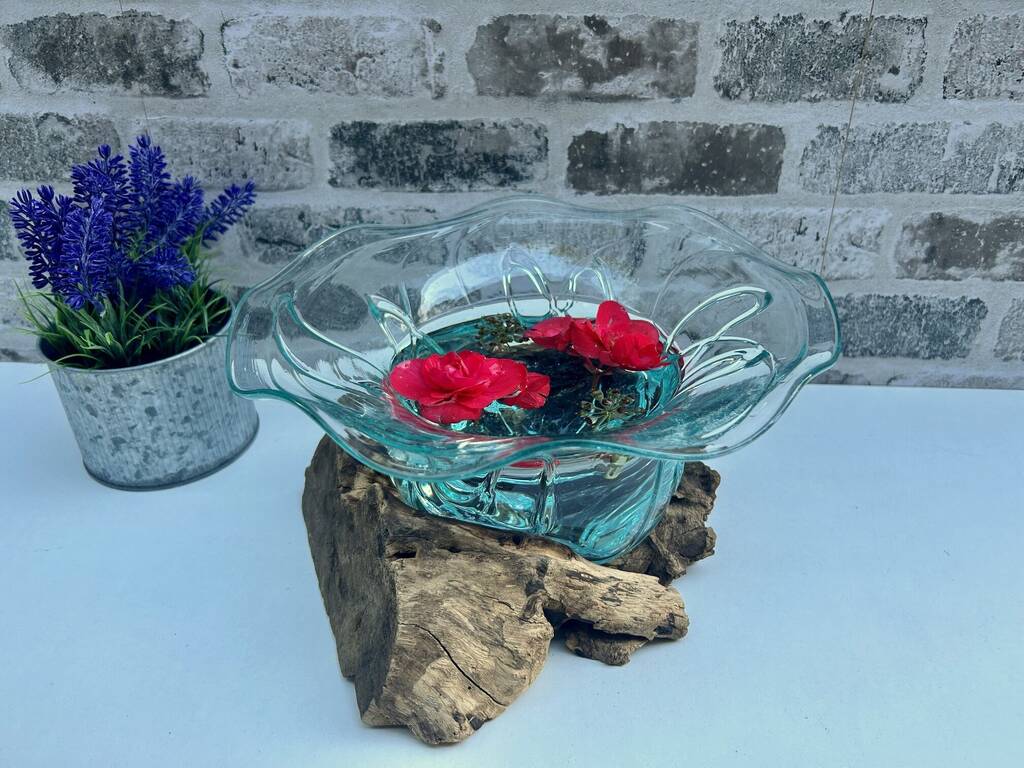 The glass bowl has been designed in the shape of a flower and differs from piece to piece.