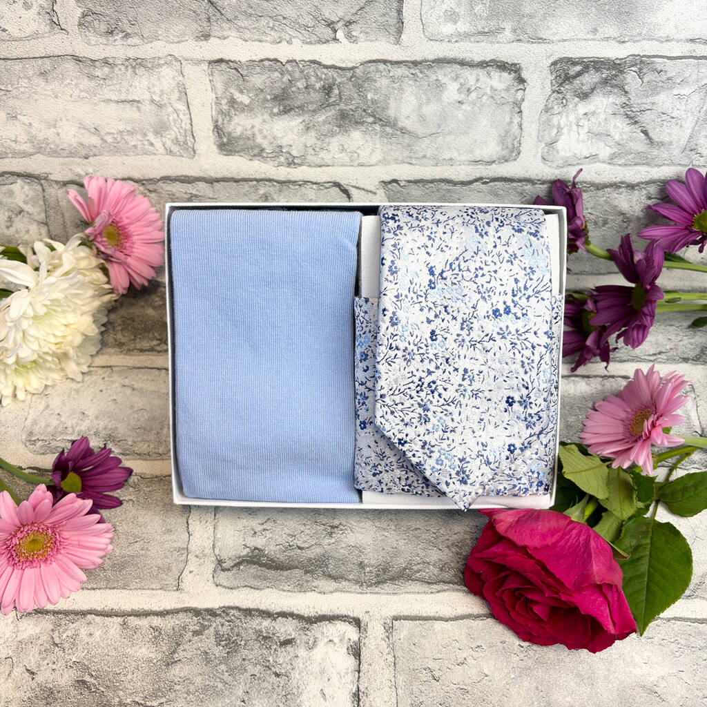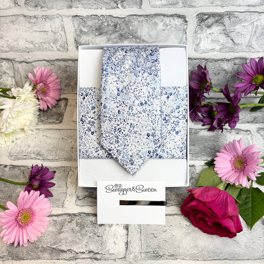 Blue And Silver Ditsy Floral Wedding Tie Set, 1 of 6