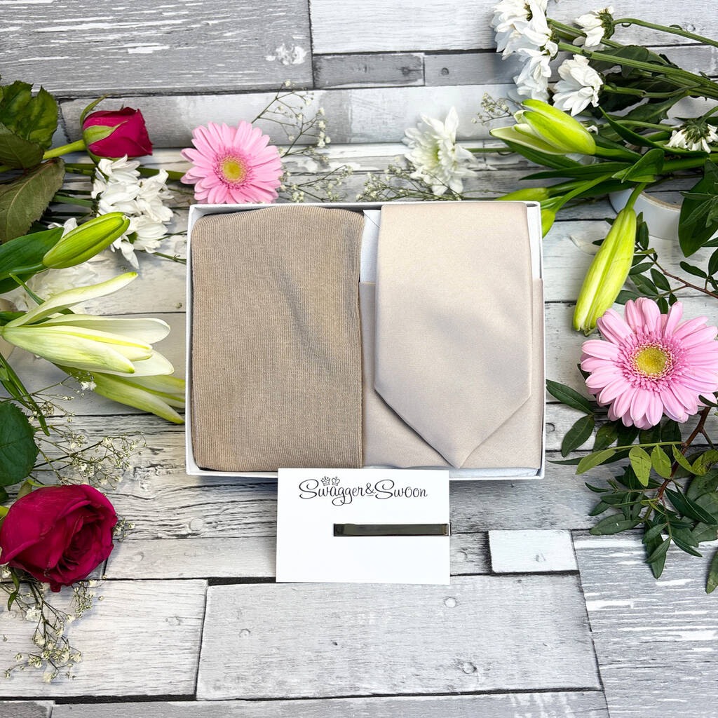 Coordinated wedding accessory set, hand-assembled in the UK. Includes a perfectly matched tie and pocket square, with cufflinks and socks for a stylish wedding look.Create a polished, perfectly coordinated look for your wedding day with this premium accessory set. Each piece is colour-matched for a seamless finish, making it ideal for grooms, groomsmen and ushers. Hand-assembled and finished in the UK, it offers the ease of a ready-made set with the craftsmanship of a personalised touch. With classic styling and a modern colour palette, it’s designed to complement your suits, bridesmaids’ dresses and overall theme beautifully. A thoughtful gift and an effortless way to elevate your wedding style.