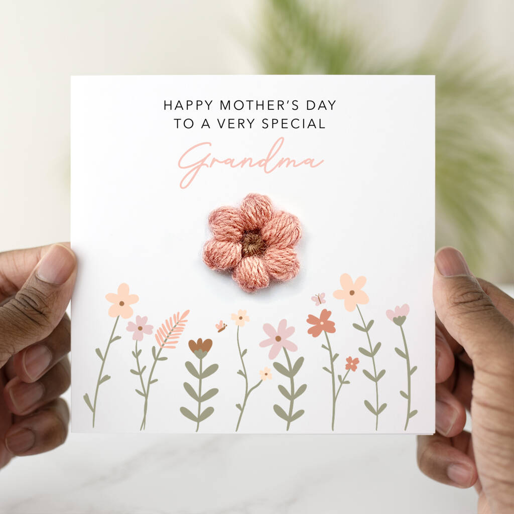 A beautiful handmade crochet puff flower Mother's Day card for your Grandma.