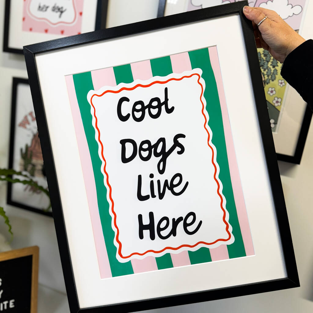 A playful hand-drawn print celebrating your cool canine companion, featuring bold stripes and fun lettering perfect as a statement piece for any dog lover's home.