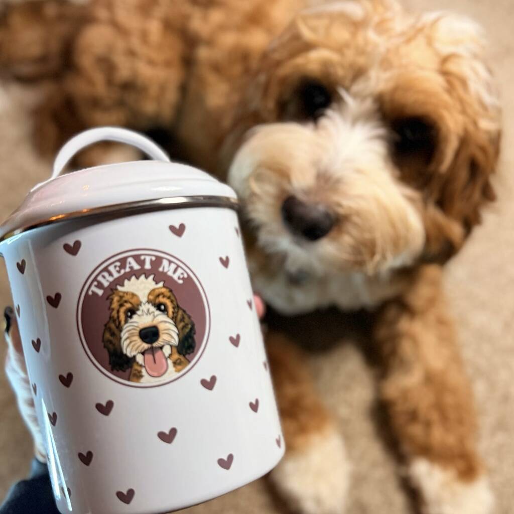 This lovely personalised treat tin is hand-printed to order with an illustration of your dog. It makes a wonderful Valentine's Day gift for dog lovers, a birthday present for a dog mum or dad, a new puppy gift, or a just because present for friends, family, or yourself and your beloved pet.