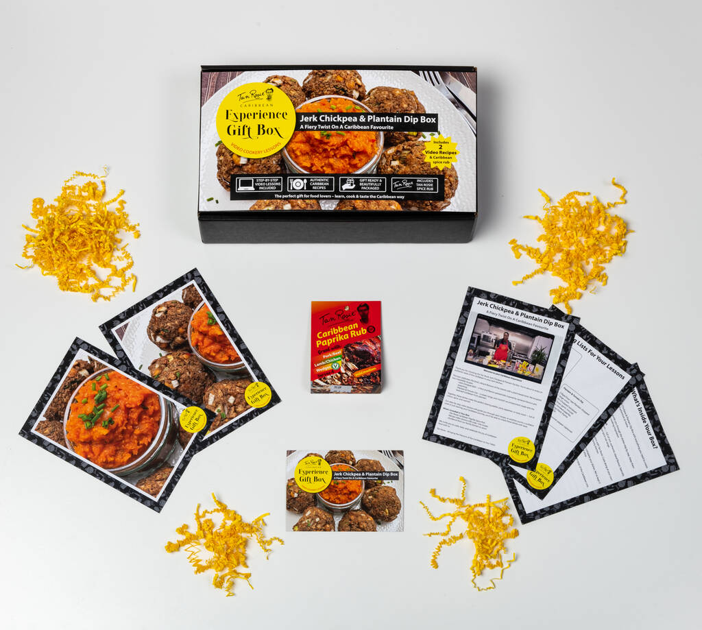 Bring the bold flavours of the Caribbean into your kitchen with our Jerk Chickpea & Plantain Dip Box. This gift-ready experience box includes everything you need to create a fiery plant-based feast, featuring crispy jerk chickpea balls, a tangy plantain & tomato dip, and golden fried dumplings. With authentic Tan Rosie spices, recipe cards, and exclusive step-by-step video lessons, you’ll cook along and learn traditional techniques with ease. Perfect for vegans, vegetarians, and adventurous food lovers, it’s more than just a meal – it’s an experience. A unique gift to savour, share, and remember.